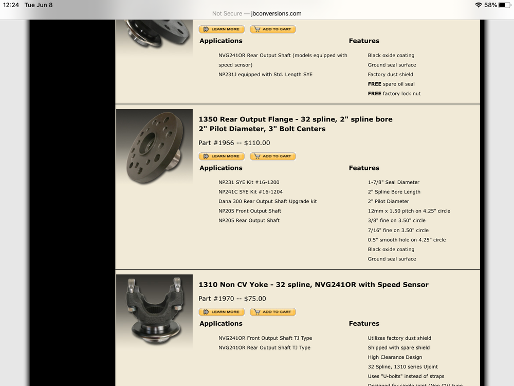 Oh crap disregard my PM that was for the front shaft. For the rear you need to measure the yoke OD of the seal surface and see if it matches a 205 seal ID. I know the 241 has a 32 spline output.It measured out to be 37 inches, currently has a 1310 CV yoke on the tcase that came with it from JB Conversions. Not sure how changing to a flange would impact that measurement. I am honestly more worried about travel. I'm currently pulling just over 14 inches of vertical travel and haven't even maxed it out. Will definitely need to be bumped and strapped based on either u joint angles or what shocks I can package under there. If I can use a stock unit that would be nice though.