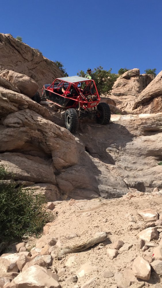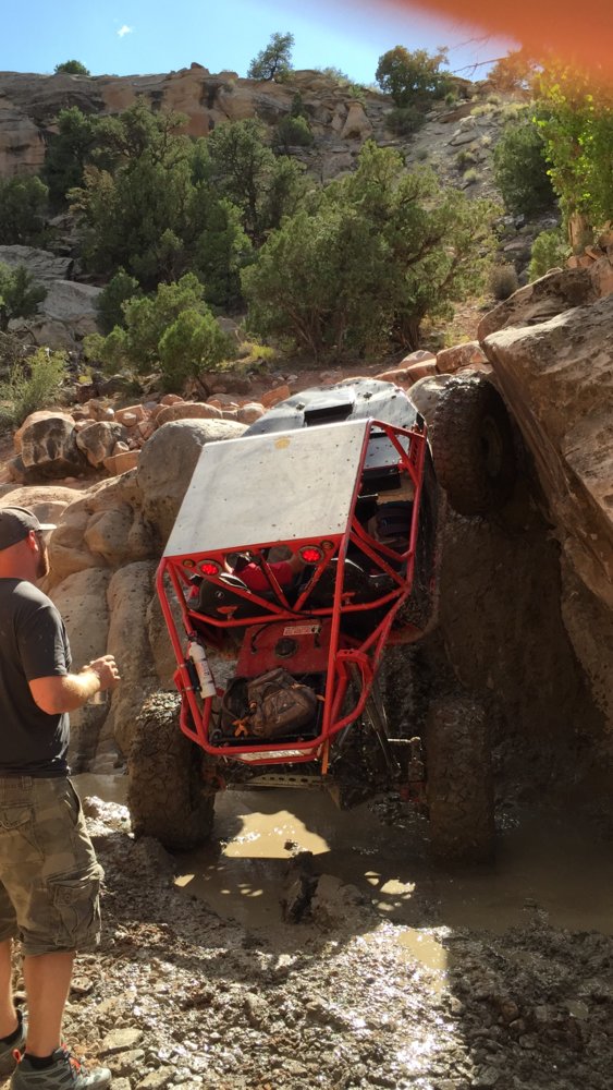 We loaded up all our stuff checked out of the campground and headed to BFE for the day. After a short discussion we decided to get big nasty helldorado out the way first. Upon getting to the trail entrance we noticed standing water everywhere so we decided to walk up to the waterfall and see how muddy it was. There was a mud hole at the base with 6-8" of standing water:( Melissa started digging a drain and it was working so we decided to let it sit and come back at the end of the day. About that time we heard a v8 rumbling towards us. It was Kevin Carroll from Red Dot Engineering. Super nice guy. After giving us some shit for being from the east coast he showed us a new line out of the canyon. It took some work but with his 42's, 24" ori's and rear steer he made it happen.