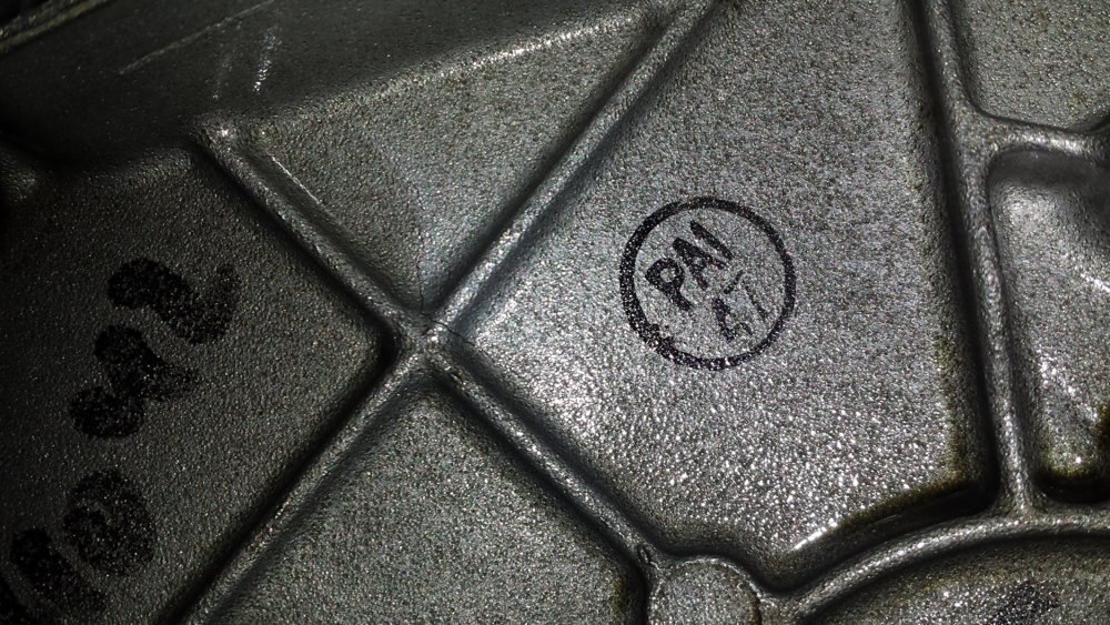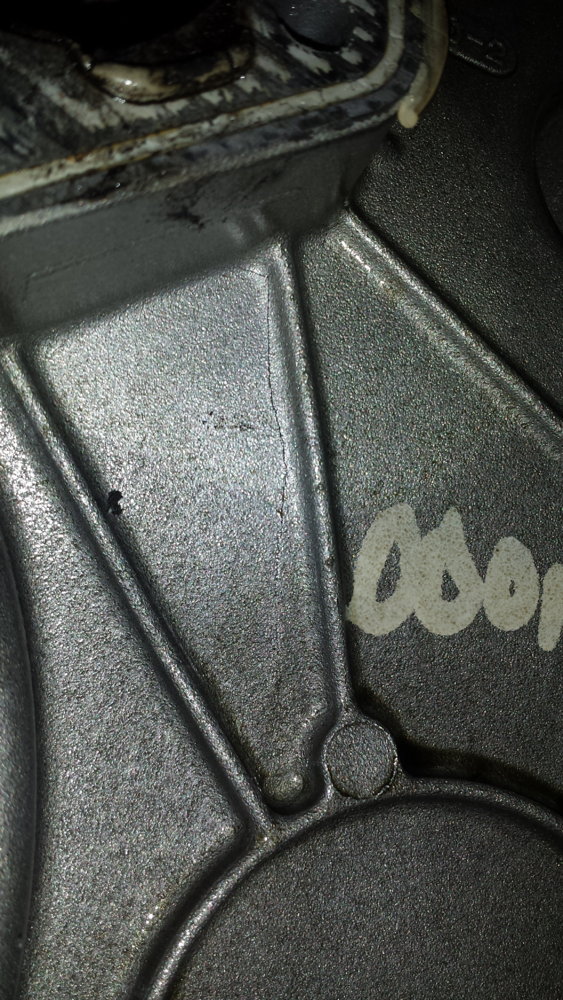 The crack in this picture, which is the back side of the timing cover, is to the left of that QA stamp. It's pretty much right through the middle of where the webbing meets. You may need to zoom in a hair to see it.