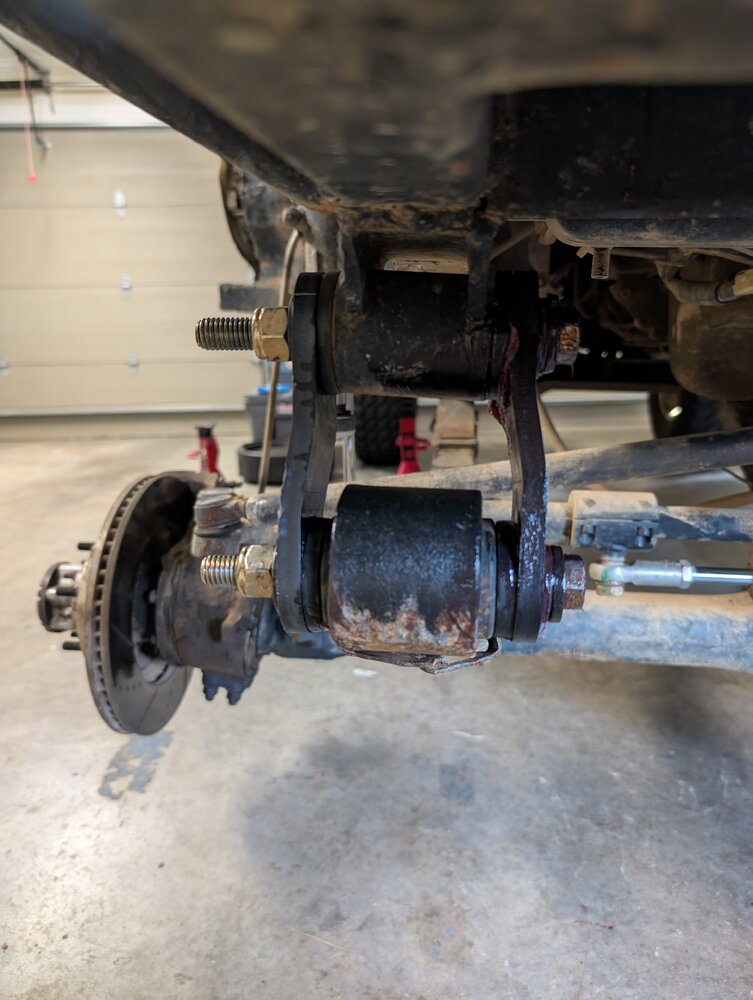 Since a job is not complete until you do it 3 times, I changed the front shackles out, a project I have been meaning to do for almost 2yrs now lol. So when I pushed the front axle forward a few winters back, I grabbed the wrong bushing tube holder thing for the shackle hangar, it was a 2" and I should have used a 2.5 to match the springs, well I found this out when I went to bolt the shackles on. Like any good Toyota owner, I said f it and just ran the shackles for "only one wheeling trip" like this /\. Well today I finally fixed that with some 2" to 2.5 shackles from Barnes lol.