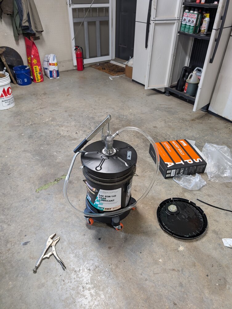 I also should have done this a long time ago, Lowe's had a 5gallon pail of gear lube on sale for 50% off a few months back, and I got a pump and dolly for it. I see why it was 50% off because it looks like the bucket lived its life outside, but whatever there was gear lube inside so win.