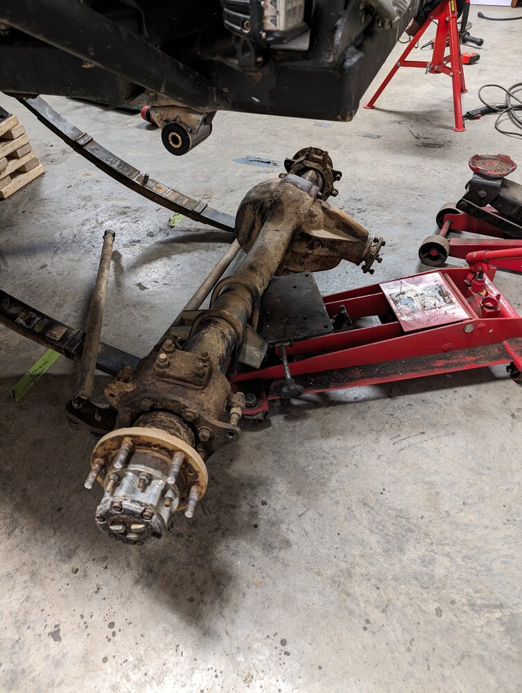 Didn't get as far as I wanted to tonight, but getting closer. Swung the axle under the truck, not without some drama first: