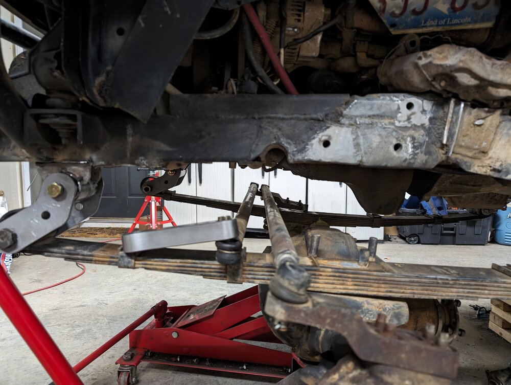 Realized one of my leaf mounts is angled outward so I need to fix that. So I gained uptravel at the oil pan, however the damn drag link is now going to not play nice with the AC idler pulley. So I need to find a solution for that problem that does not involve full hydro steering or ditch the AC.