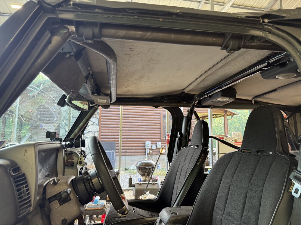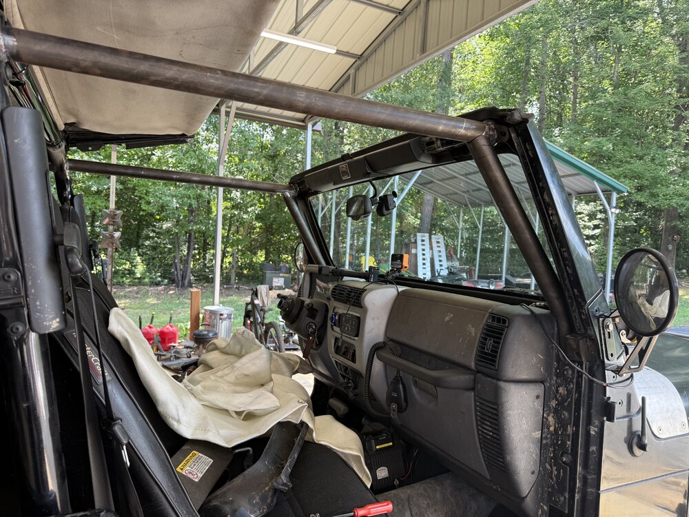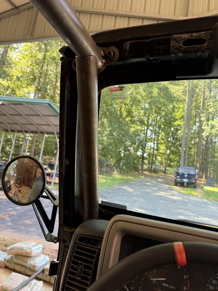 After staring at that cage bar over the windshield for the last couple of weeks, I decided that I hated it. So I cut it back out and made a new one that tucks under the top latches and above the rear view mirror. Ended up being the same cut length and bends as the one I cut out but with different notches. The one I cut out got recycled into the center roof bar. Threw some diagonals in and I’m pretty happy with it. I’ll eventually add some stuff in the back too and probably a couple gussets in some corners. I managed to bump the rear view mirror just right at some point of folding the window up/down and cracked the windshield. And then it got a little worse before I finished it. It’s not horrible but it’ll need a new one again at some point.