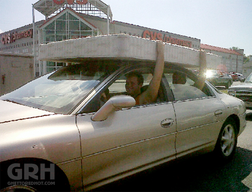 Looks much better BUT- you'll need to open the rear windows and run a ratchet strap around the cab and nose. You'll also need to drive the whole way home with your arm up, holding it 'just in case '. (A passenger helping isn't a bad idea either)