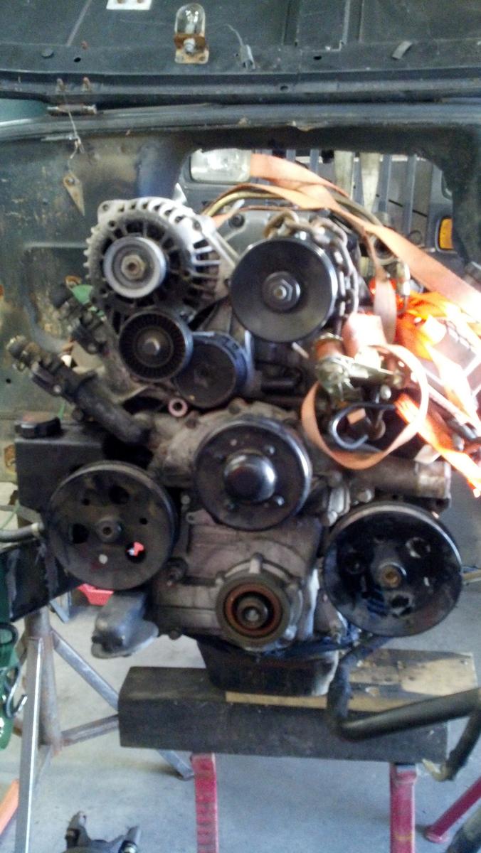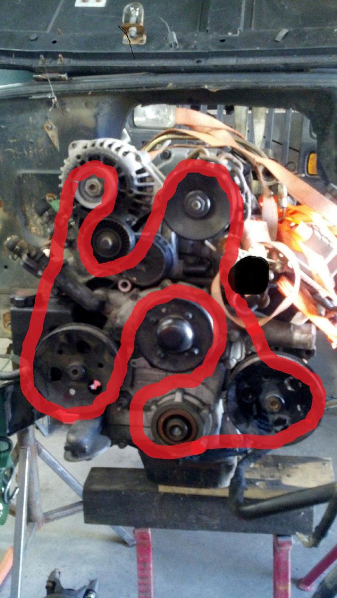 I ordered an offset blower pulley that lines it up with the inner pulleys, then grabed a ps pump from a 98 camaro. I know my paint skills lack but does anyone see why this wouldn't work???