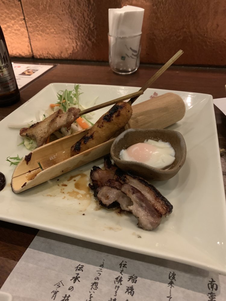 Then the star of the show, chicken on a stick (definitely NOT chicken) and a corn dog made of chicken skin patte that you dip in the barely poached egg in the little bowl.