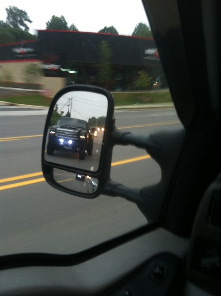 Hey your mirrors are out!! LolView attachment 165423 not a good pic but this guy should be here. Flat black single cab Dully lifted, halo headlights, and cowl hood. Keep trying to race me in stop and go traffic