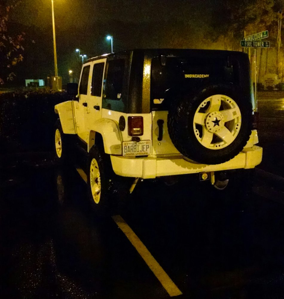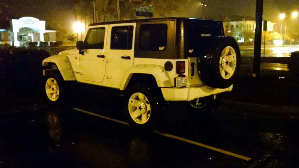 Found a great one tonight. Sorry it was dark and raining. Douche bag parking job, rock stars painted white to match the Jeep and then as I was leaving the parking lot noticed the snorkel! :rockon::rockon:
