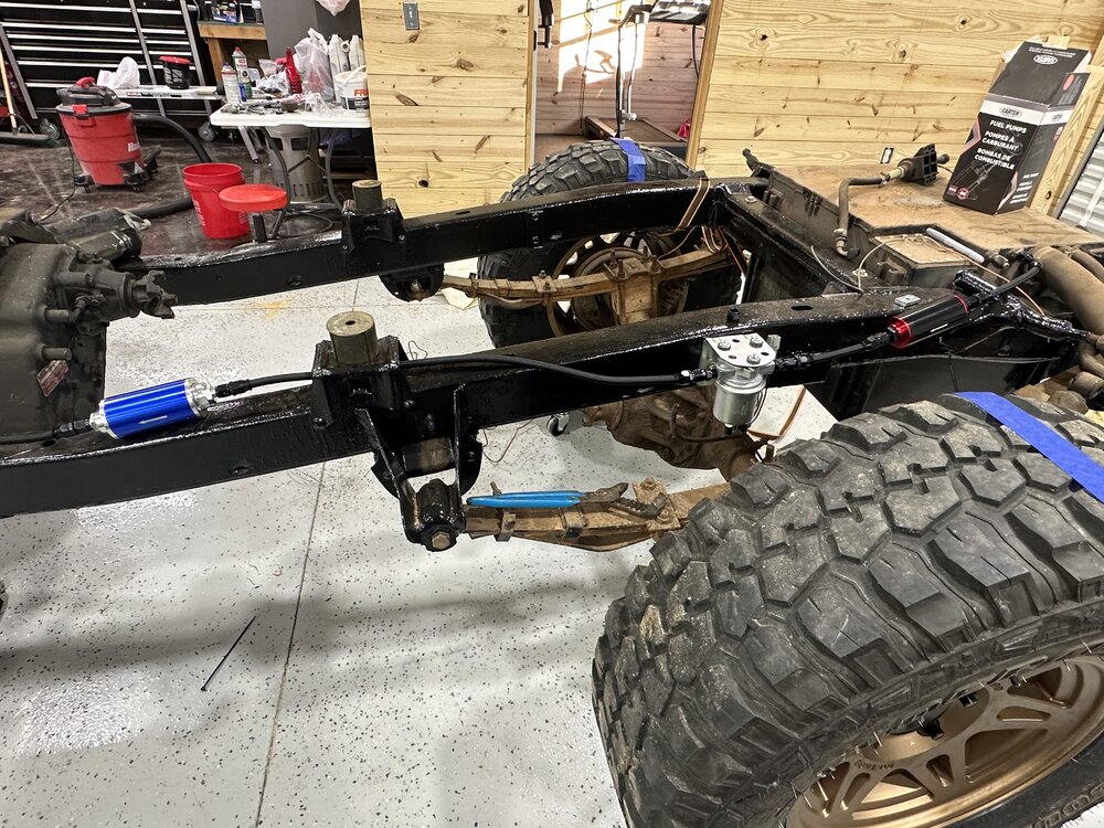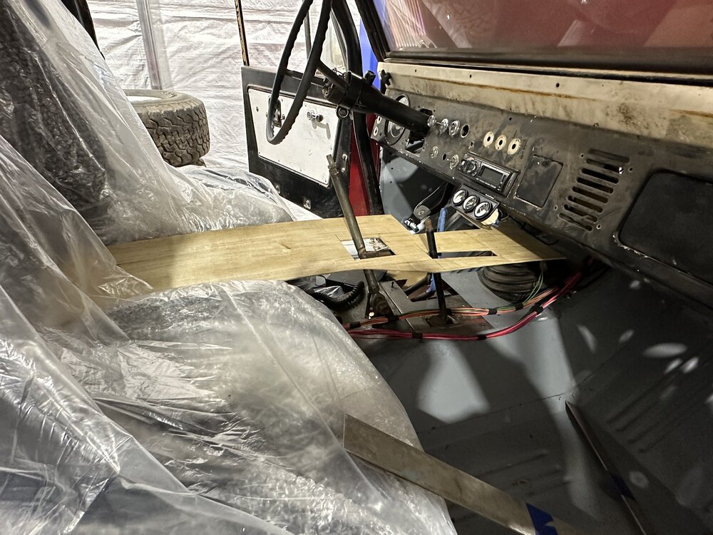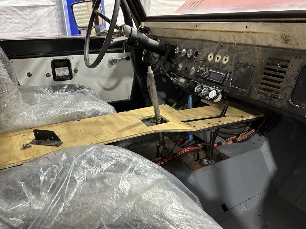Been tinkering this weekend. Got my bumper/winch mount started so I will at least have recovery on the trails. Worked a little more on a center console to cover the shifters so I can put stuff down, have a drink, etc. transfered my initial design onto a thicker piece of plywood. Still need another support but happy so far. Tried to “flex” the suspension as much as I could with my jack. Still plenty of travel obviously but it was nice to see nothing obviously binding yet. Got the holes for the cab body mounts drilled, just need a second set of hands to torque it all down. Getting there slowly. Still need to pull my fuel line and replace a fitting that’s got a slow leak and might need to replace the thermostat housing due to a small leak.