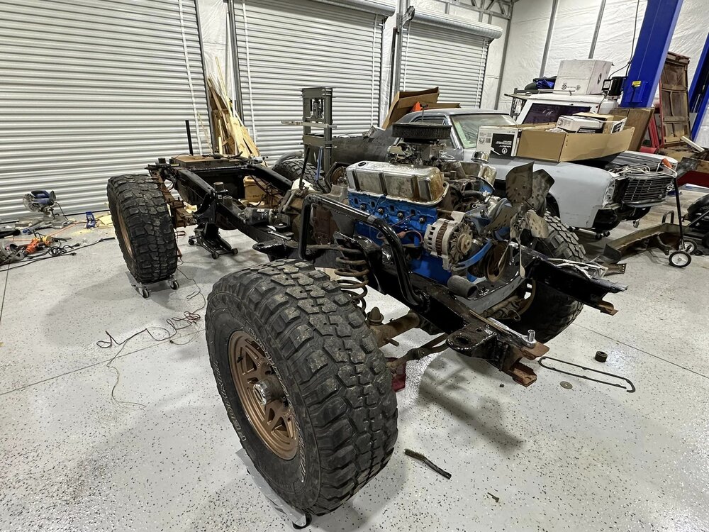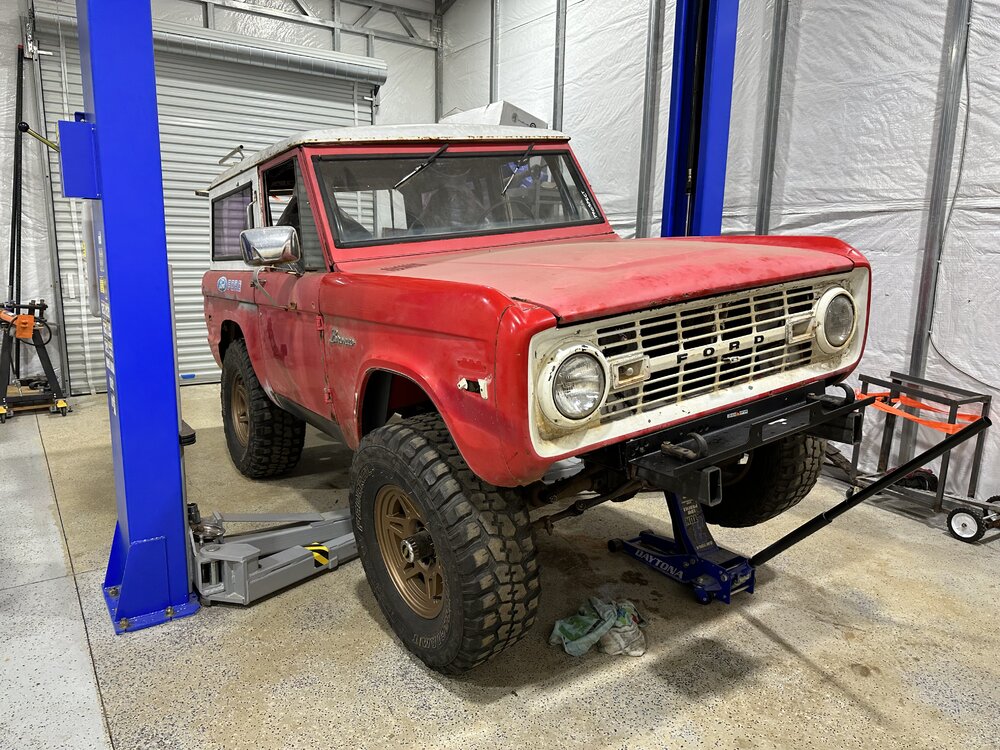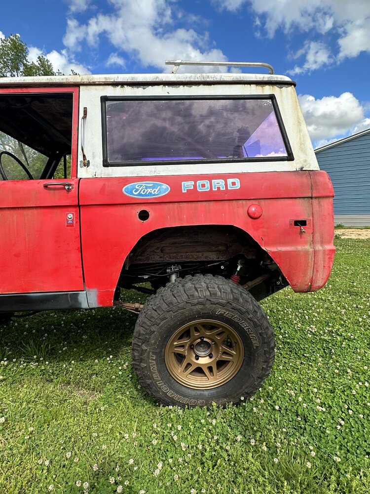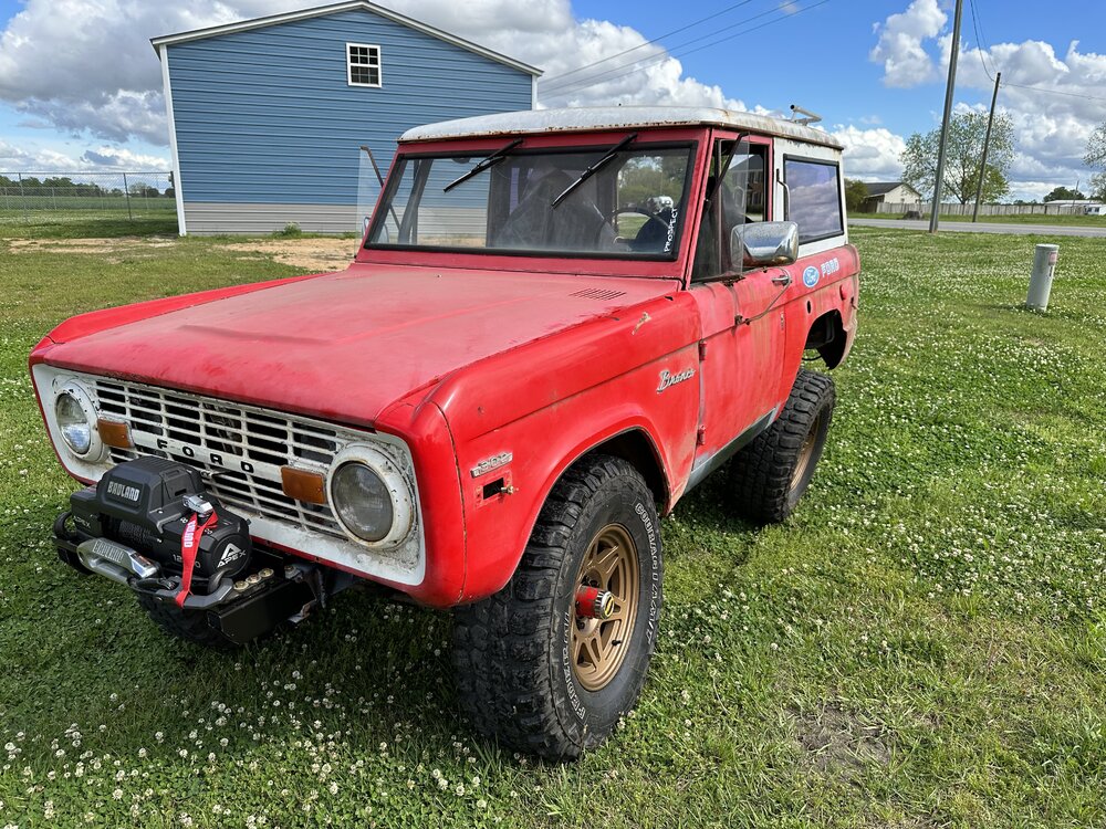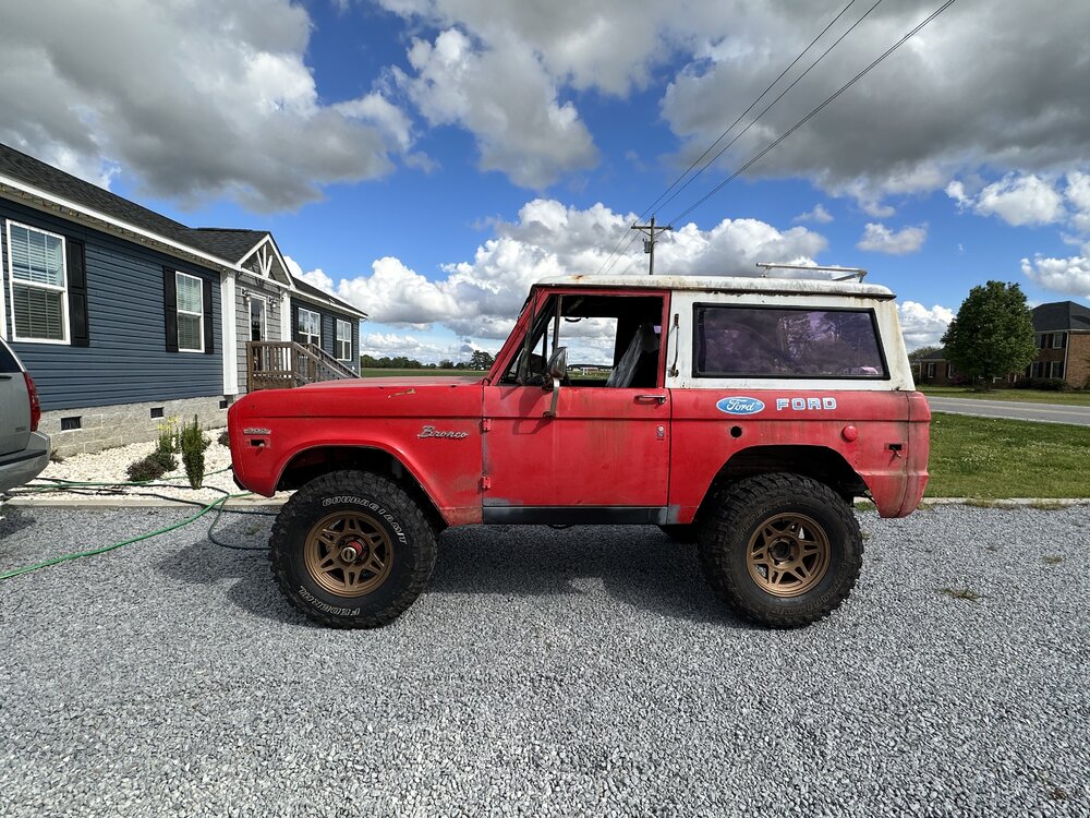 Been working on the bronco some this week. Finally got the distributor in and was working on getting the rest of the wiring done. After that got wrapped up, I wanted to check to make sure the ignition worked like it should since the replacement I got sheared the locating tabs and I was still using the factory switch. After troubleshooting some loose wires, the pins all fell out of the lock cylinder. After replacing that the rock auto starter turned the engine over 1/4 of a rotation and locked up. Sent that back and got a new high torque starter from a 93 f150. Rewired the solenoid to work with the new starter and it spun up like a new truck. Found someone who wanted my factory manifolds and traded them for some long tube headers. Finagled them into place and got the spark plugs swapped and wires ran and voila! She fires up. Still have to take plenty of time to both adjust this new carb and get the timing straight but at least I’m in the right area. I see a leak that looks like it might be from the oil pan gasket but I’m not too concerned about it. It’s going to leak, or at least that’s what I keep telling myself to keep from tearing it apart again. Brakes soon and then driveshafts. Small things in between, like bleeding the cooling system, making an overflow tank and torquing the suspension. I picked up some 3” lift spring to replace the block in the rear but not sure if I’ll end up swapping them In or not yet.