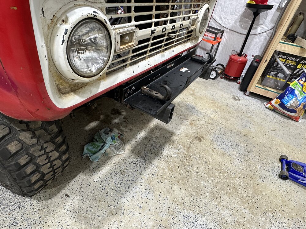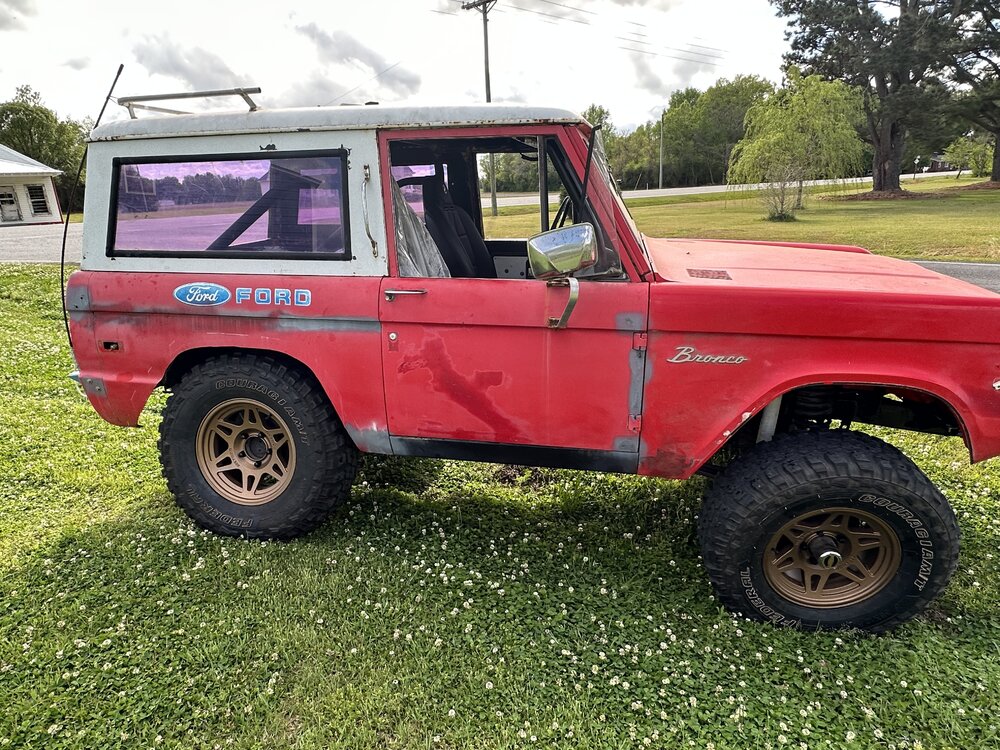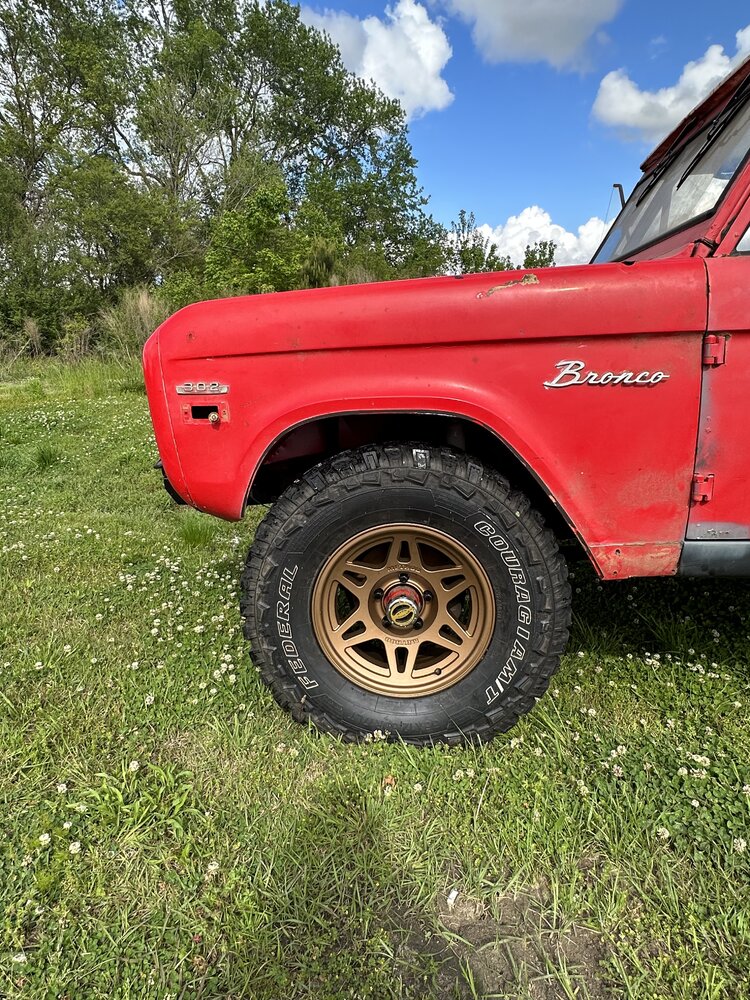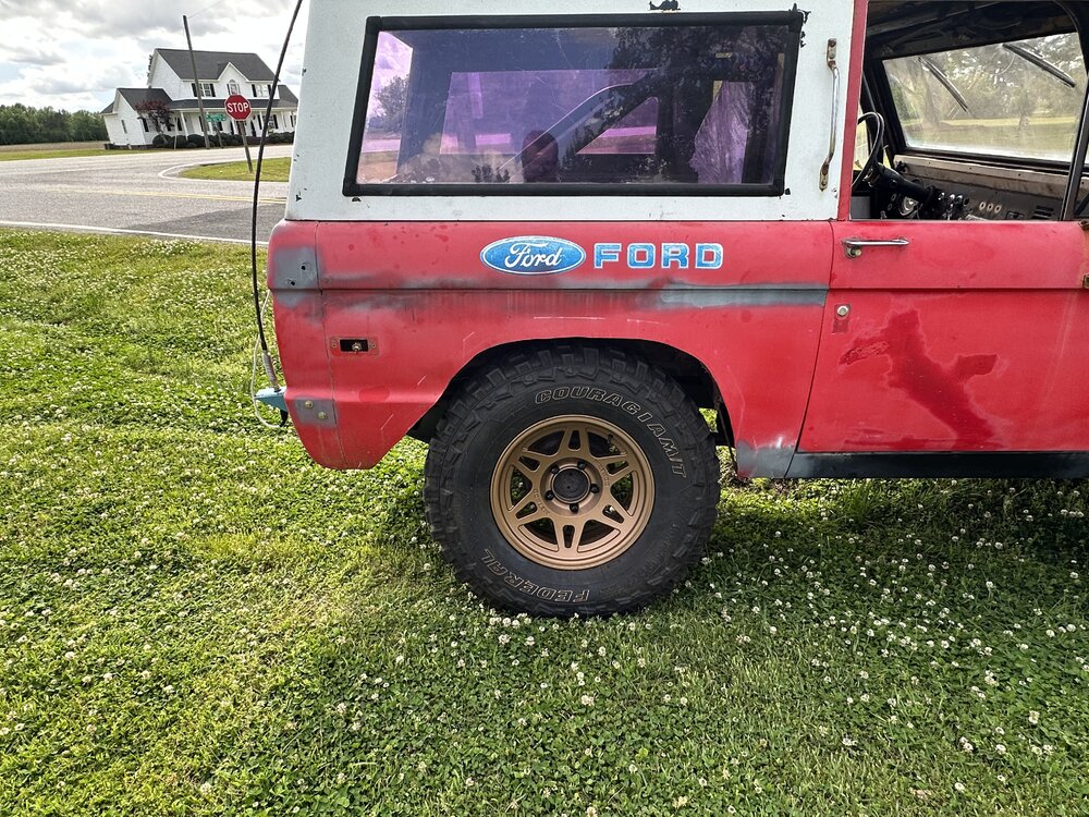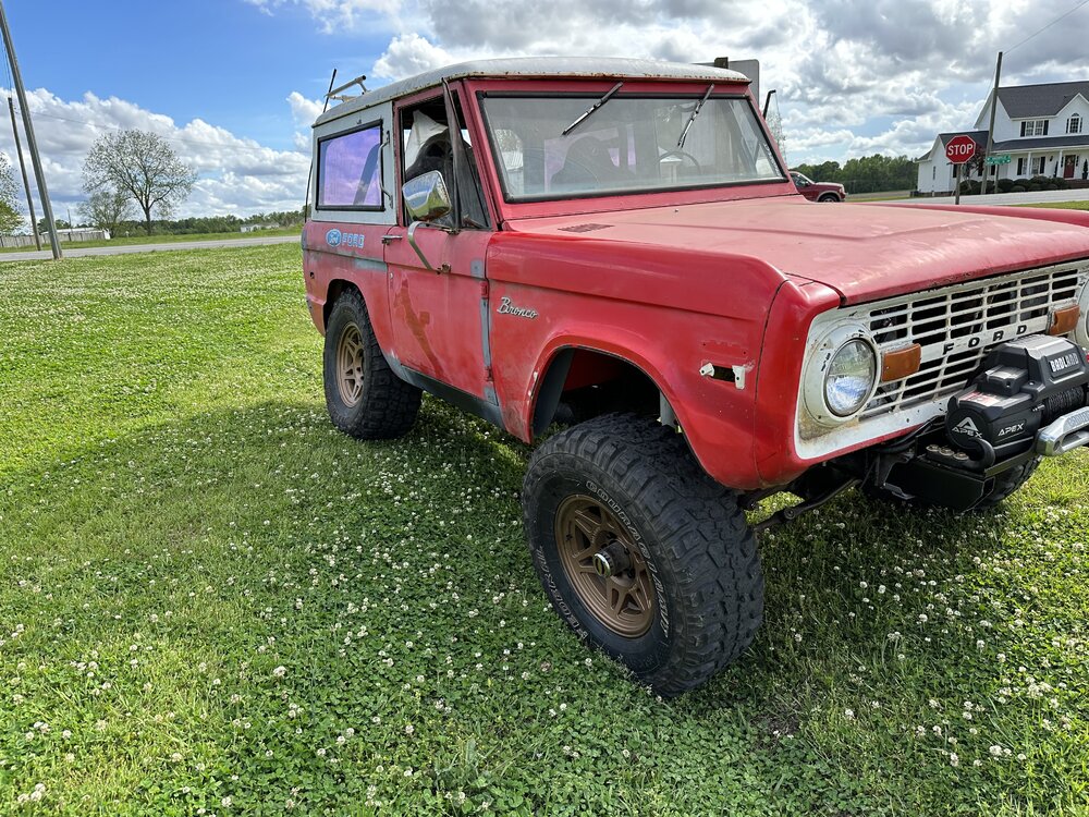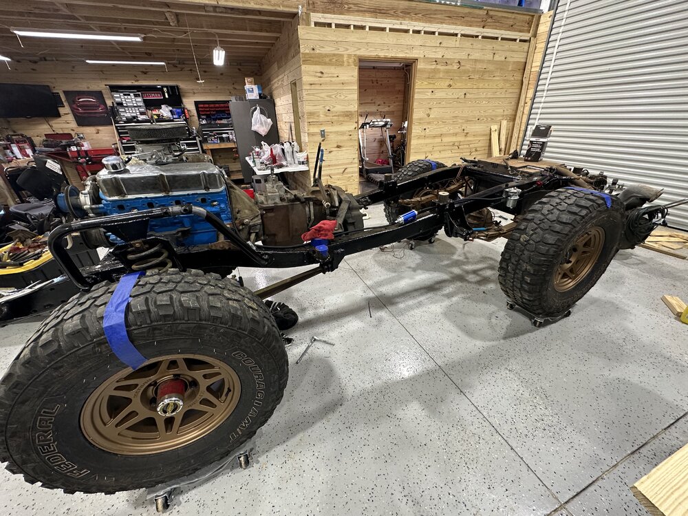 Been working on the bronco some this week. Finally got the distributor in and was working on getting the rest of the wiring done. After that got wrapped up, I wanted to check to make sure the ignition worked like it should since the replacement I got sheared the locating tabs and I was still using the factory switch. After troubleshooting some loose wires, the pins all fell out of the lock cylinder. After replacing that the rock auto starter turned the engine over 1/4 of a rotation and locked up. Sent that back and got a new high torque starter from a 93 f150. Rewired the solenoid to work with the new starter and it spun up like a new truck. Found someone who wanted my factory manifolds and traded them for some long tube headers. Finagled them into place and got the spark plugs swapped and wires ran and voila! She fires up. Still have to take plenty of time to both adjust this new carb and get the timing straight but at least I’m in the right area. I see a leak that looks like it might be from the oil pan gasket but I’m not too concerned about it. It’s going to leak, or at least that’s what I keep telling myself to keep from tearing it apart again. Brakes soon and then driveshafts. Small things in between, like bleeding the cooling system, making an overflow tank and torquing the suspension. I picked up some 3” lift spring to replace the block in the rear but not sure if I’ll end up swapping them In or not yet.