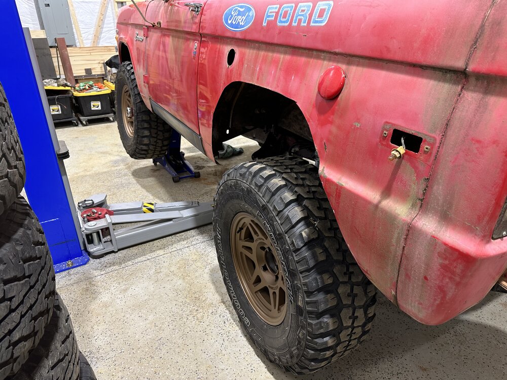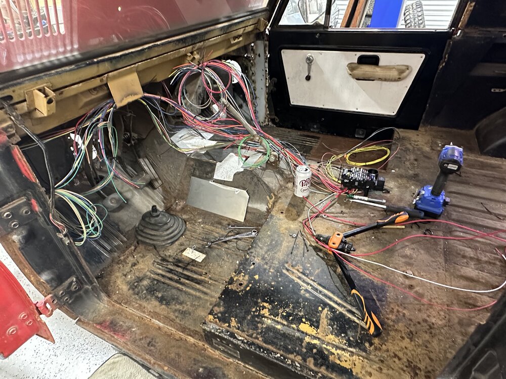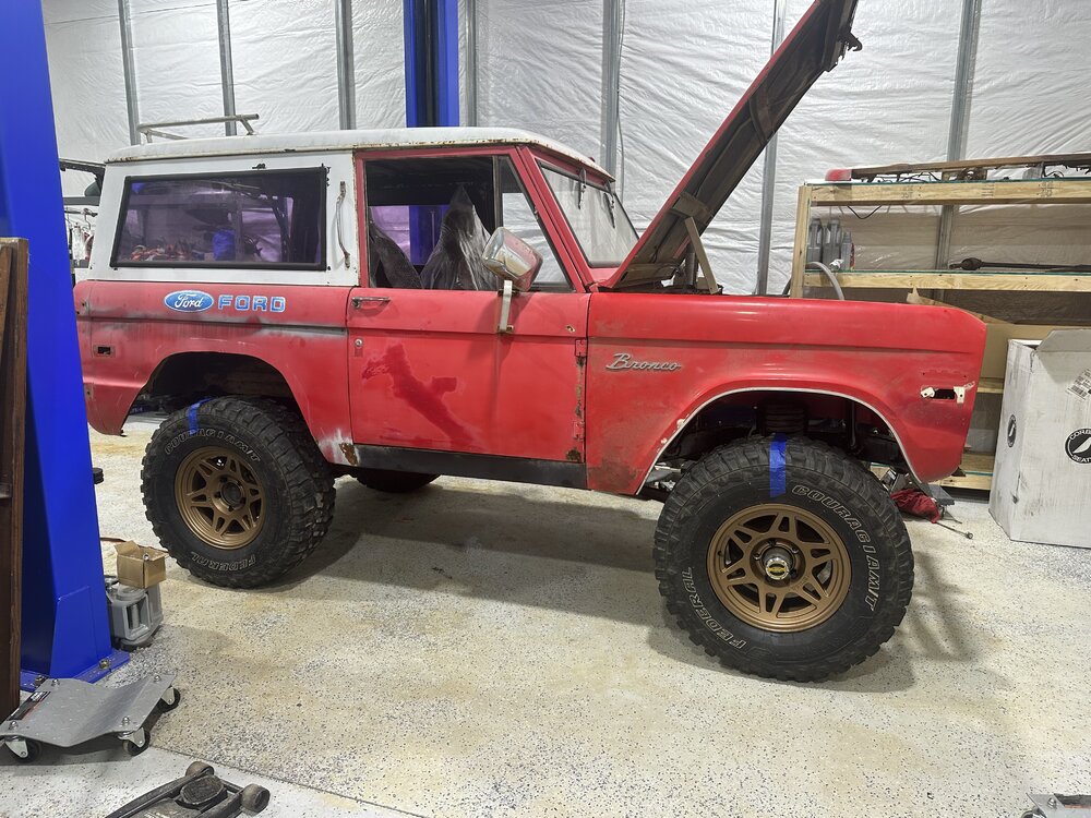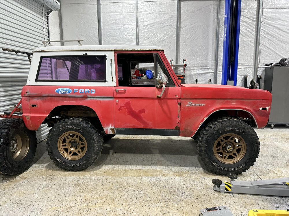 Been putting in some hours this week in the shop getting the main trunk of the harness routed and terminated correctly. Replace the last kicker panel, not my best work but plenty of welds to hold it in place. I may buy some panel bonding adhesive to give myself some reassurance. Stick welding sheet metal is definitely not fun. I do not recommend. Got the floor cleaned up, patched the transmission hole since that will be a permanent panel and riv nutted the case panel in place. Drove out to Charlotte after I got off Sunday morning to pick up some bronco parts from @snipes243. Great dude, got some lift coils for the front to get rid of the spring spreader lift that was on there. It sits mostly even now, the rear might sit just a hair lower. Little bit picky stuff here and there to be done, but the brunt of it is, driveshafts, brakes (booster, mc, all new lines and probably rear wheel cylinders while I’m in there), and headers. I made the harness as easy to remove as possible so that I could pull the dash with ease, the harness with ease, both together if I wanted, just a component, etc. without having to pull every single thing out of the truck. Need to go through and write out a wire diagram chart for the truck before I seal it up any further. In a holding pattern as I finish up the wiring, hoping to save up the cash for the headers and brakes soon then one final purchase for driveshafts.