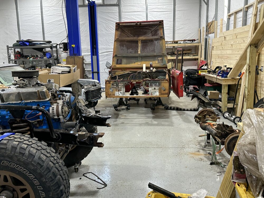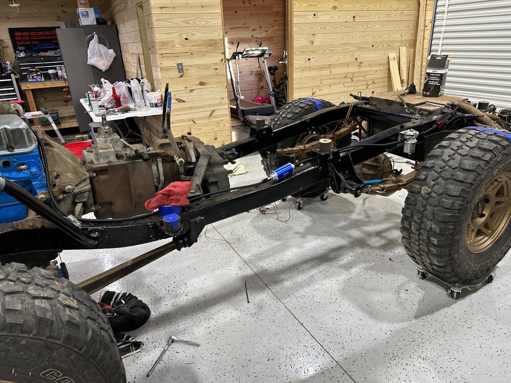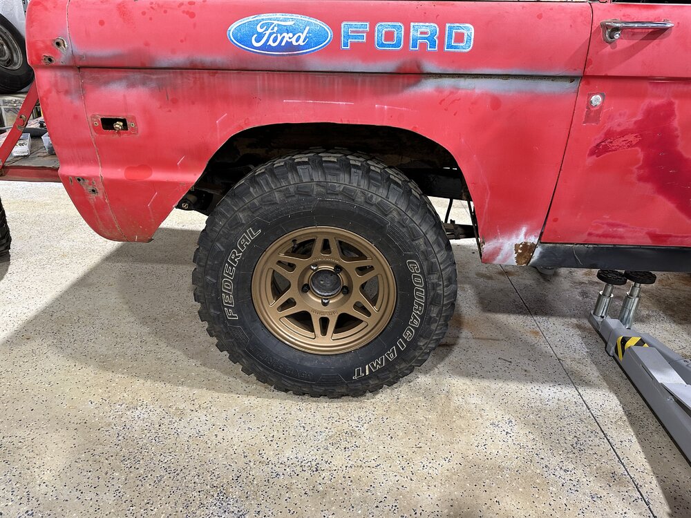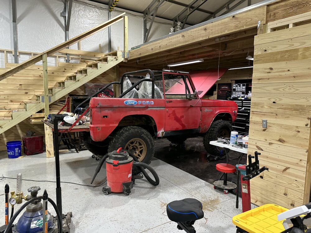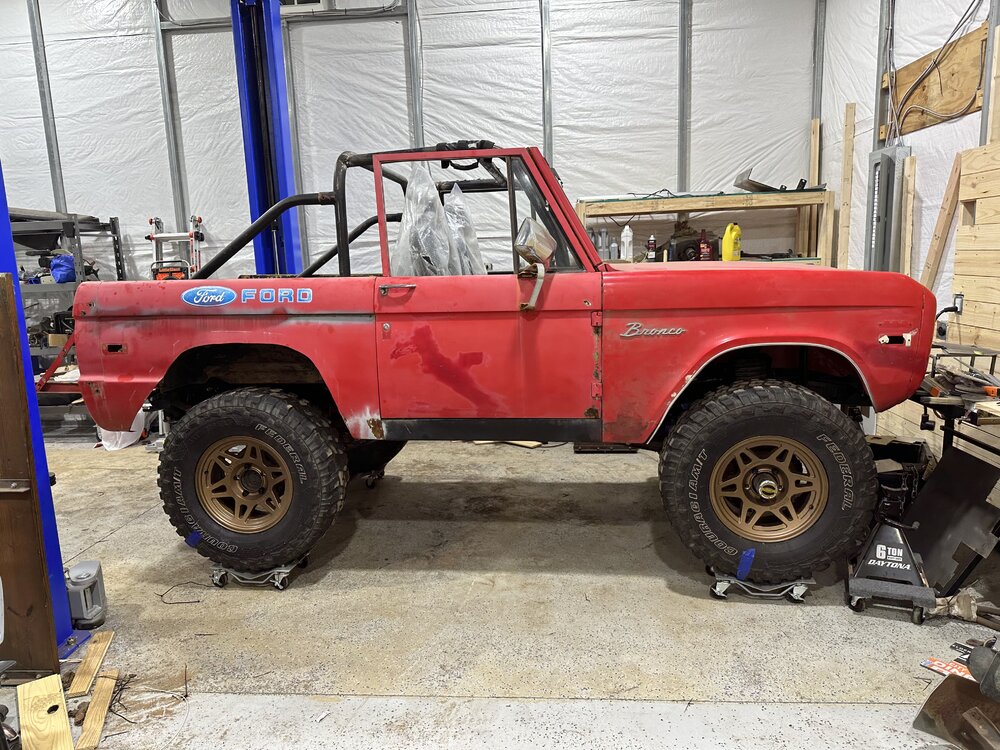 Been putting in some hours this week in the shop getting the main trunk of the harness routed and terminated correctly. Replace the last kicker panel, not my best work but plenty of welds to hold it in place. I may buy some panel bonding adhesive to give myself some reassurance. Stick welding sheet metal is definitely not fun. I do not recommend. Got the floor cleaned up, patched the transmission hole since that will be a permanent panel and riv nutted the case panel in place. Drove out to Charlotte after I got off Sunday morning to pick up some bronco parts from @snipes243. Great dude, got some lift coils for the front to get rid of the spring spreader lift that was on there. It sits mostly even now, the rear might sit just a hair lower. Little bit picky stuff here and there to be done, but the brunt of it is, driveshafts, brakes (booster, mc, all new lines and probably rear wheel cylinders while I’m in there), and headers. I made the harness as easy to remove as possible so that I could pull the dash with ease, the harness with ease, both together if I wanted, just a component, etc. without having to pull every single thing out of the truck. Need to go through and write out a wire diagram chart for the truck before I seal it up any further. In a holding pattern as I finish up the wiring, hoping to save up the cash for the headers and brakes soon then one final purchase for driveshafts.