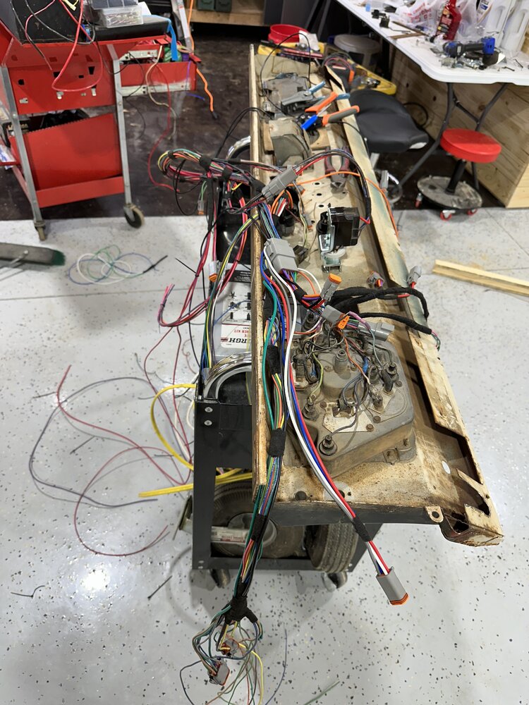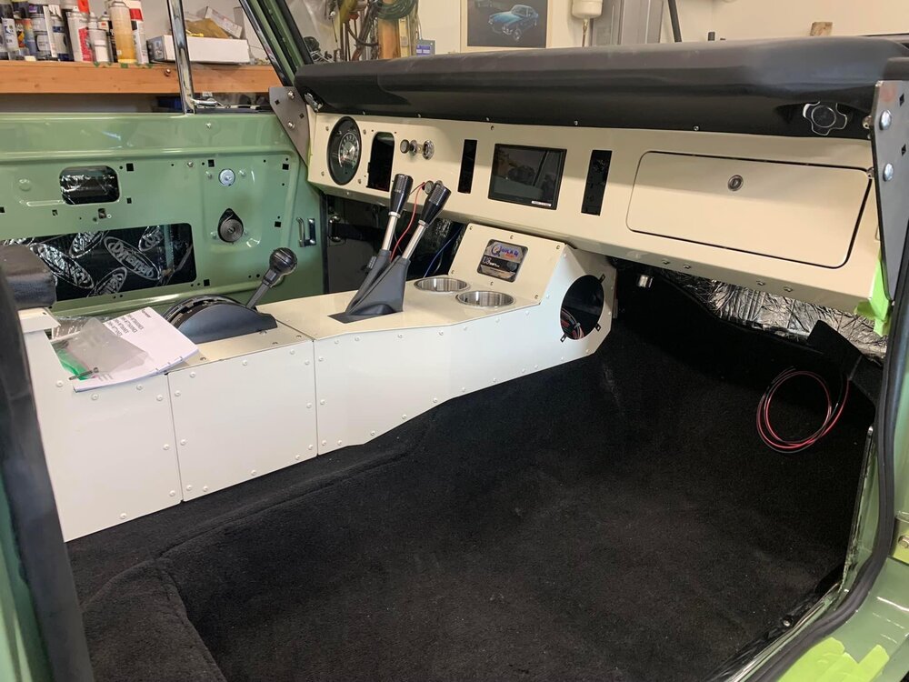 While I’m dealing with some air compressor woes, holding me back from replacing the last sheet metal panel, I decided to start laying out the wiring harness and putting connectors on it to make it easier to disassemble later on. Got most of it laid out and a small pile of extra runs that can be used later. Decided to mount the fuse panel in between the seats where I can cover it with a center console but still be able to access it without climbing under the dash. Found a picture online and wouldn’t mind doing something similar if I can extend the shifters in a usable way for the transfer cases. We will see what I come up with, no rush on that project though. Jacked the frame up to see if I could count the rotation of the pinion to get an idea of gear ratio. With one tire spinning, 2 whole rotations at the tire was a little more than 3.5 rotations at the yoke so I’m thinking 3:55 ratio front and rear. Not great but at least they are the same and should be usable in the meantime. Plenty of gearing in the trans and transfer cases to make up the difference. Got the body off the lift and onto some furniture dollies with Jack stands so I could work around it easier when wiring. Got the fuel system plumbed yesterday. I know the pump should be lower but this is lowest I could get it without it being in the way. Ed’s bronco had it about in the same spot for years so I don’t think it will be much of an issue. Also replaced the output seals in the Dana 20 so I can start filling stuff with oil soon.