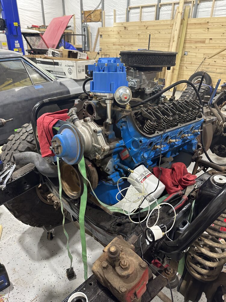 Spent the past couple days working on a wiring diagram, just need to go and record my pinouts now. Today I filled her with oil and primed the oil pump, solid 60 PSI. The priming tool didn't fit correctly so I ended up scavenging the points distributor to make a prime tool. Slapped the HEI distributor in to make sure it was going to clear the heater fitting and temp sender (the 302 in the big bronco had that issue). Everything seemed to clear, with the exception of the fuel line on the front of the carb hitting the cap tie downs so I need to rotate it or replace the 45 with a 90. Been working on trying to get the track bar off the dana 30 to see if it will be the right angle for now or if I need to invest in the drop pitman arm and adjustable track bar right away. (Still trying to save the budget a little). Coming along slowly, trying to keep from getting burned out. The cost of these last few steps is a bit of a bummer but we will get there eventually. On a side note, the lift has been great at this point to check clearances, route wires, etc, and then still be able to get close to the engine without being underneath or crawling all over the core support. So glad to have one finally.