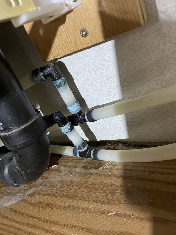 And if that wasn’t good enough, I have a 90° fitting above a T fitting cracked in the PEX pipe under the kitchen sink. It’s in an awful spot, not gonna be fun to fix at all.