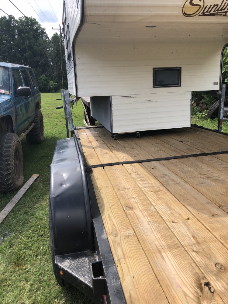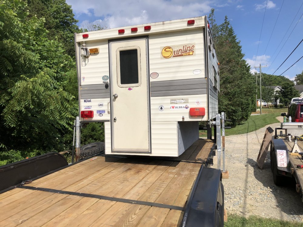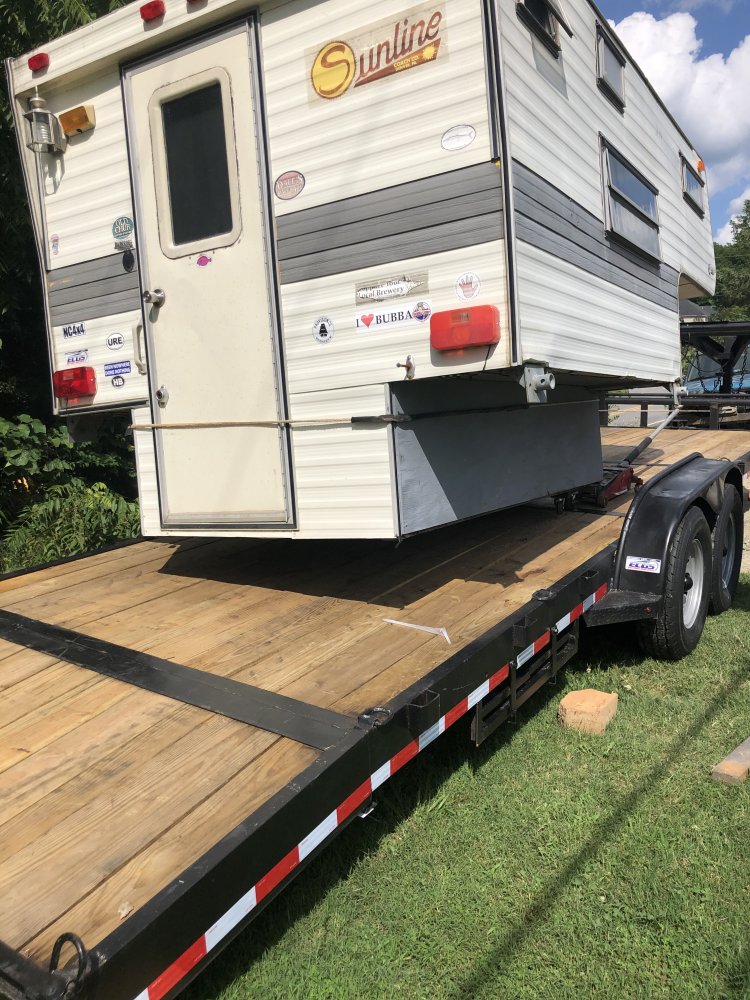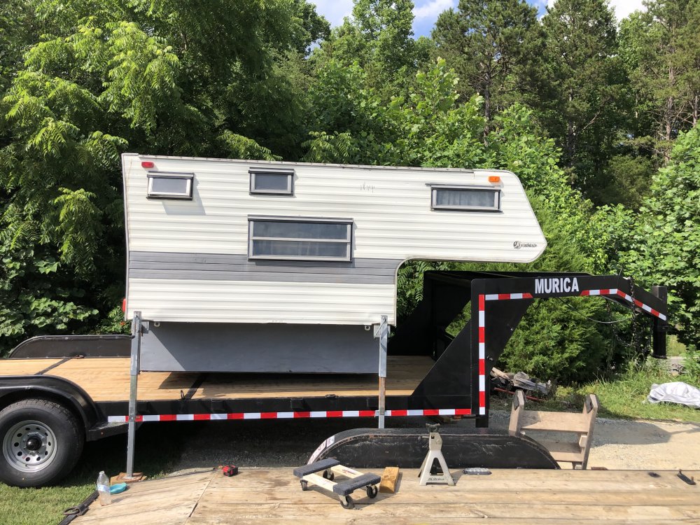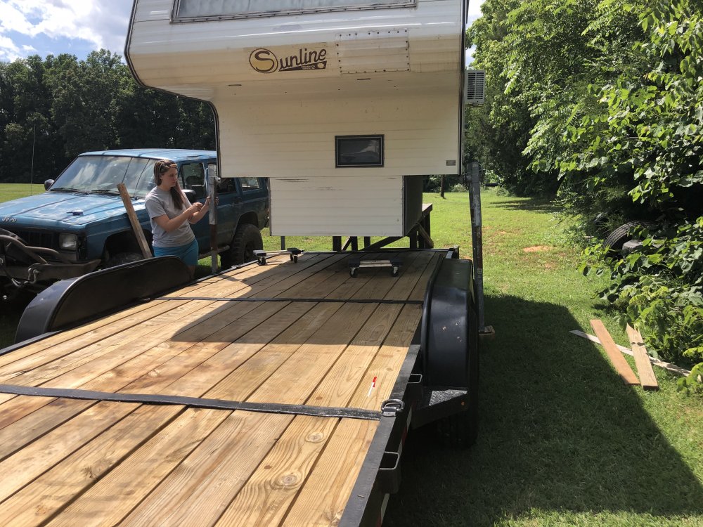 I got some tiny dollies and lowered the camper down into the back of the trailer.