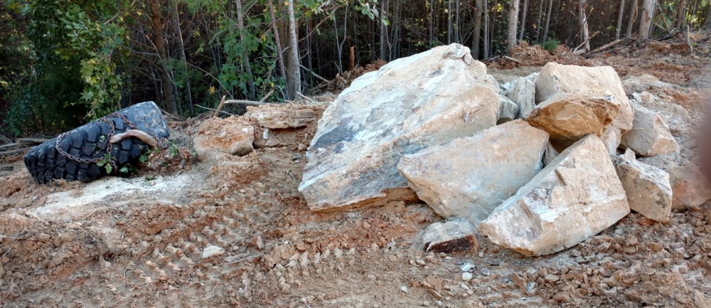 Pinnacle, King side of the pilot mountain?More grading today, it is crazy how much dirt I cut out and pull down the hill and it STILL needs a lot more cut out to get level. I have one section in the wall with a lot of rock that slows the process a little, but I guess on the other hand it's some big rocks to use for yard art. That is a 46" tire for reference.