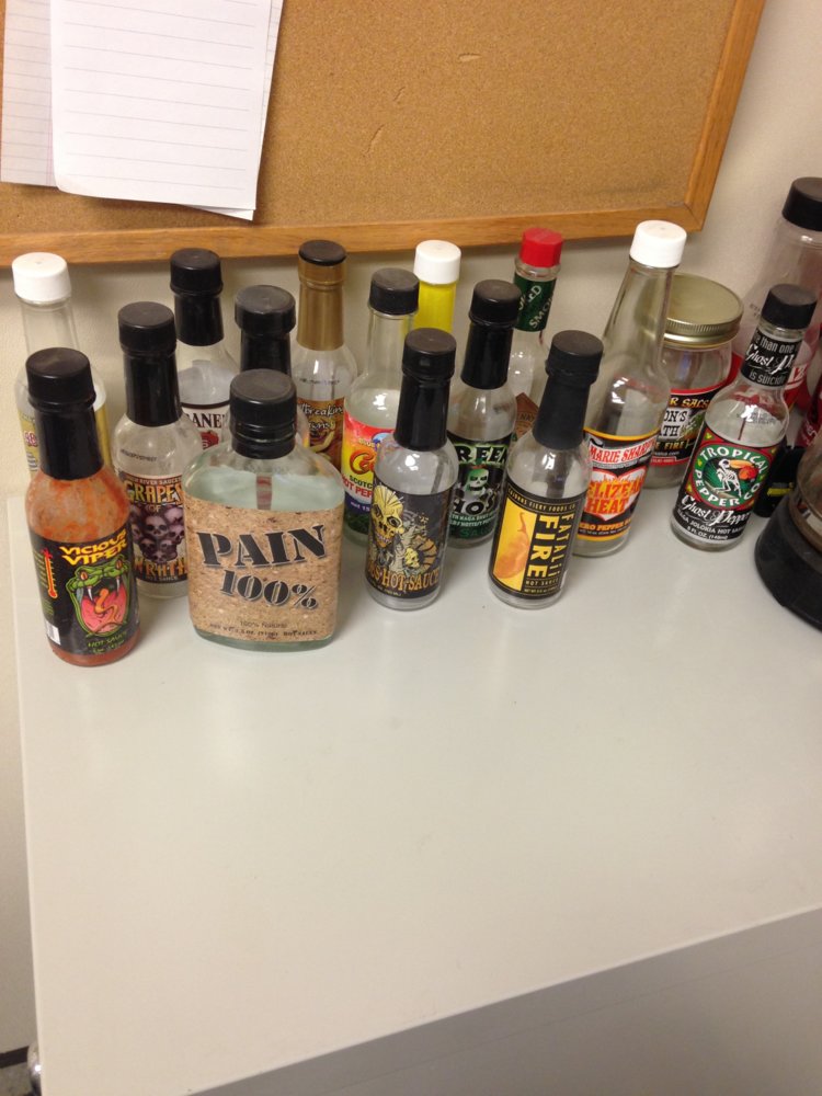 Only got a few drops left of the Vicious Viper there on the left. Just got a few more at home that I'll have to restock my shelf here at work with. There's no decent hot sauce shops to my knowledge in this area, so I typically call up Fire & Spice in Wilmington down yonner and ask him kindly to pick a few and ship them to me.