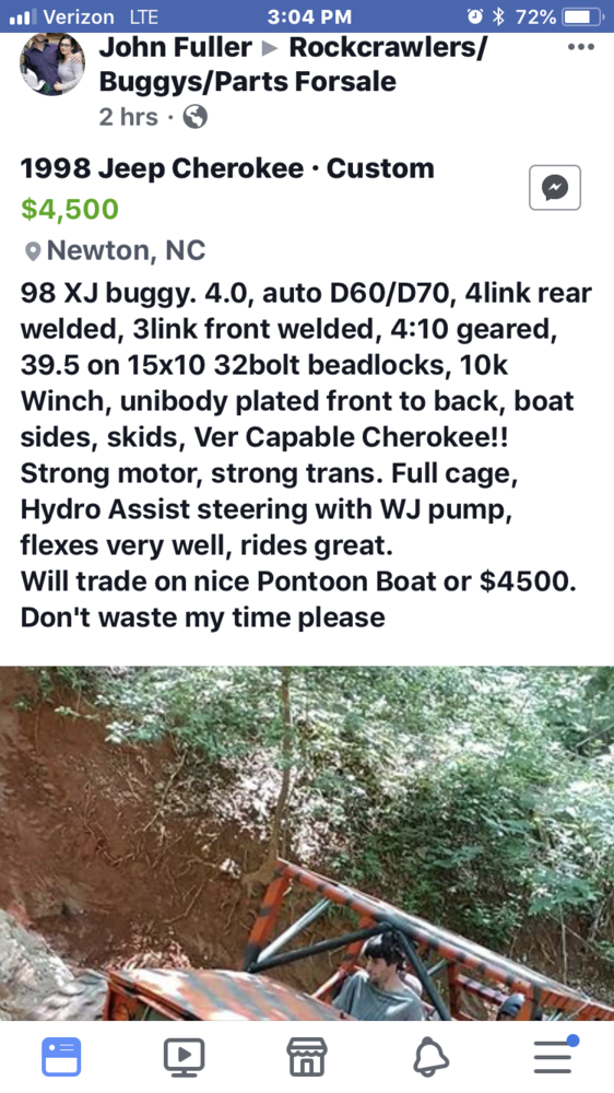Yeah yeah yeah, so what.. really wanting to get back into fishing but the legit way with a boat. Jeeps are easy to come by and build but boat isn't. Still using the crawler but figure I'd try and trade it for nice Pontoon Boat