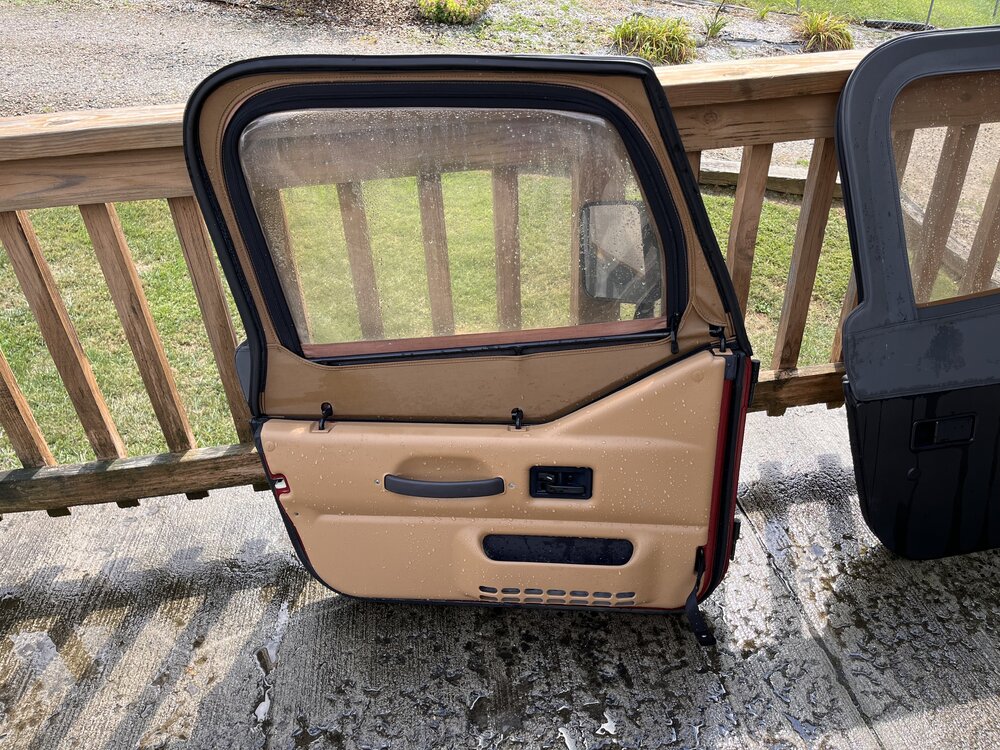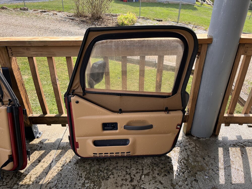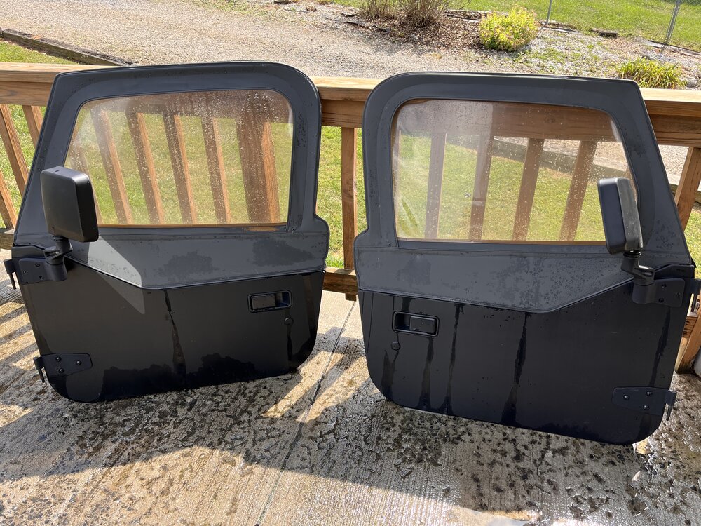 Half doors and soft uppers for a Jeep TJ 1997-2006. Doors were burgundy but are primed black to match the Jeep and the door panel is tan. One mirror glass is missing. The door panels and uppers were dyed gray but I have removed the dye from the door panels and they are tan again. $600