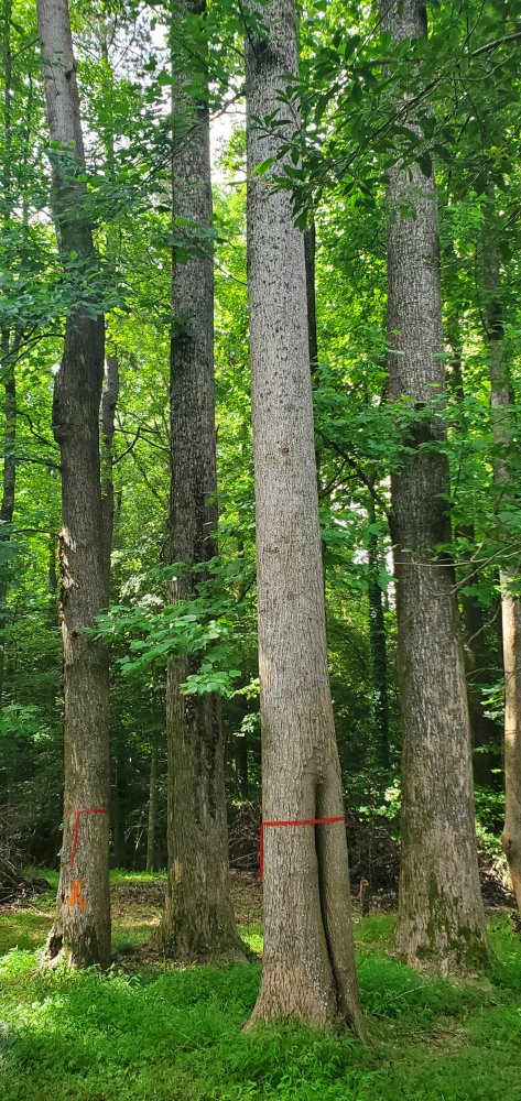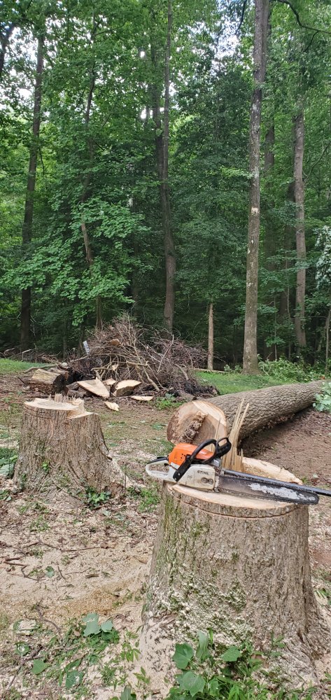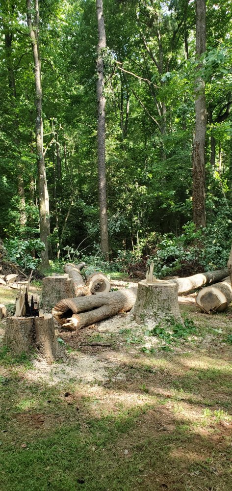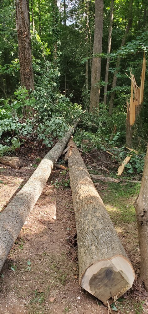 None of them fell were i wanted them to,between the big pine on the left and the big poplar on the right w the dead ivy on it.The feller seemed to be a bit green and a few if his cuts were off.Also 2 of them hung in other trees and rolled as the fell.