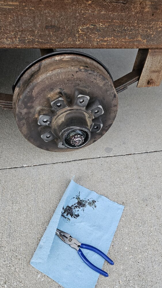 Bought this trailer 8 yrs ago, it's on the first page of this thread when Jeremy owned it. Anyway the neck has always been too low so last year I added a 3rd axle and lifted it 4.5" . Headed to AL for a week last week and the brakes were non existent and the 3rd axle had bad seals, Monday replaced 4 of the brakes with way marked up parts from a trailer dealer and put the two new spares I had on the back since those two were the older tires, brother said he for sure torqued the lug nuts. Brakes still sucked but left yesterday anyway.