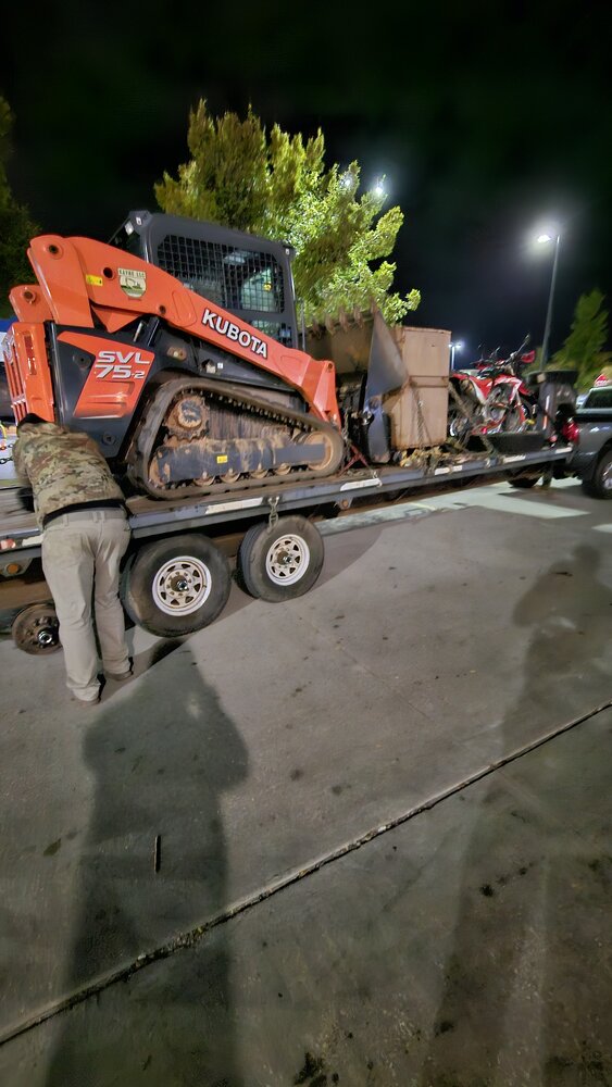 At 430 somewhere past Montgomery the driver rear tire disappeared which caused the passenger rear to shred itself, spent 3 hrs looking for a hub or replacement studs finally said screw it pull the skid steer all the way forward and keep going on 2 axles.