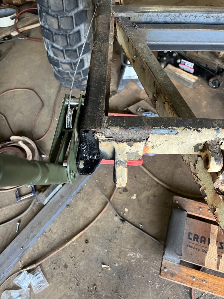 So I discovered on the donor trailer a bolt front center through the tub to the frame. I remembered there was one on my frame. So we now have the tub attached with a bolt. Also pulled four of the tabs and bolts. Man they are trashed.