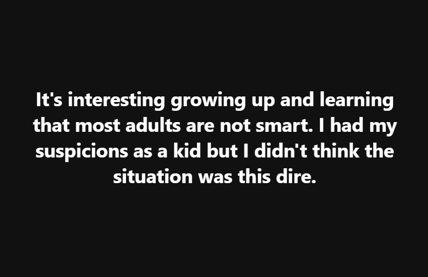 Got myself in a little trouble last week for pointing this out to my 8yr old. He was asking about a dumbass aunt I have who makes up ailments for attention. He said, I thought only kids did that? Told him nah, lots of grownups do it too. As you get older you'll realize that most folks are idiots. My wife was not amused when he recalled that story to her.