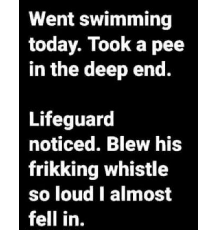 Funny story, when my son was about 4 we were at a hotel pool and he had to pee. We walked all over and couldn't find a bathroom so I whispered to him "hey buddy, when we get back just pee in the pool, it'll be fine". So we go back, I jump in and I hear my wife yell "Chase, no!" and I turn around and he's got pants down getting ready to pee in the pool. He yells out "but Daddy told me to do it!"