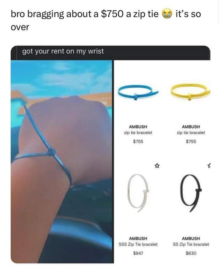 The actual AMBUSH ones are made of brass or silver and just look like a zip tie, so the cost isn't really out of line with other bracelets. Now as to why someone would spend 300 bucks on a bracelet that looks like a zip tie is still confusing to me, but who am I to judge lol.