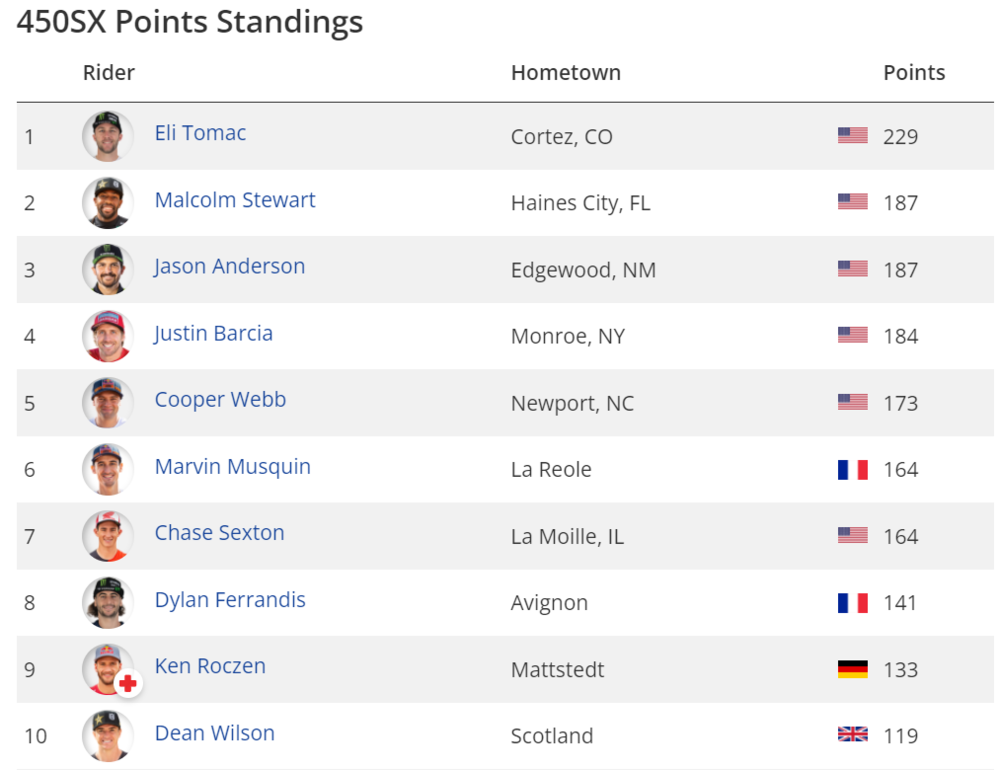 Webb down 56 points. Championship over. Tomac up 42 points, Championship over for everyone else unless he has a night like the other guys had last night. I saw something that said he could get 4th in every race from here on out and still win.Well, that sucks. Tomac has a 42 point lead now. I hope none of the guys who crashed out are seriously injured and miss any races.