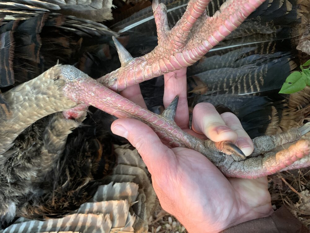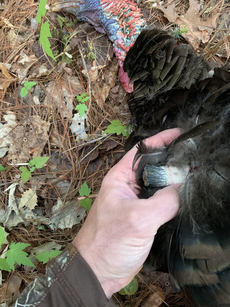 Nice bird. Have killed a couple of birds that had beard rot starting? It’s weird how that happens? Called my daughter off a bird that came strutting in front of us and I couldn’t see a beard? Had a full fan and gobble but no beard. Looking back now, wish I would have let her shoot. Congrats on the bird.Finally got an NC bird this yr on 5/2. Heard this bird gobble @5:53am. I knew about where he was and started climbing through the rhododendron. Got near the peak of the mtn, gave a hoot and sure enough he was just on the other side slightly down hill on the bank. Setup right on the peak, after some conversation and some great gobbling I shot him @20yds at 6:26am. Solid 1” spurs, 19# and NO beard! Guess he was a picky eater like me. It’s said this is from a vitamin deficiency and their beard will become brittle and break off. Never seen one with it this short.