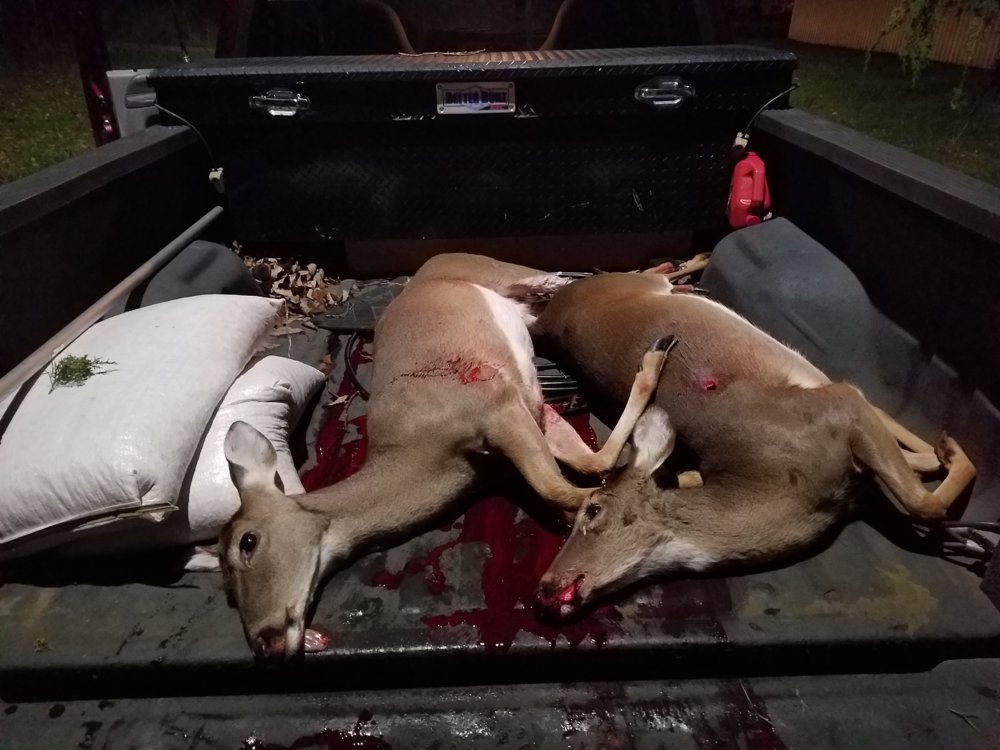 I must be living right...first BP/ML deer last weekend & first double this weekend. 120# @ 55 yards & 100# @ 105 yards. The one @ 105 yards fooled me on her size & I had already lowered my rifle out of the stand & started packing my bag when 9 does walk in & stop @ 50 yards. Noticed one that we call nanny doe that stomps & blows at anything & everything. Pulled my .308 back up, threw on my ear muffs & tagged her right behind the shoulder. Neither one made it more than 60 yards.