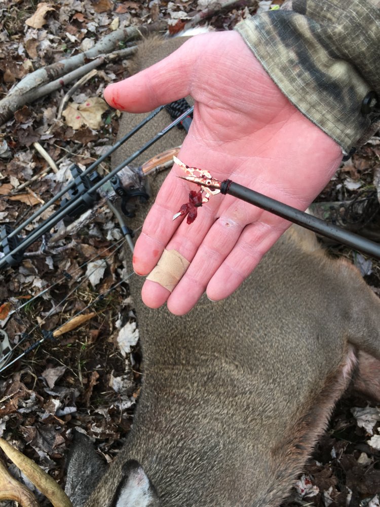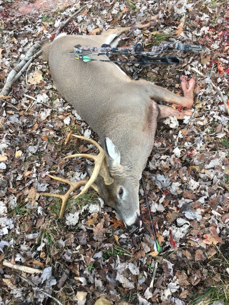 I was getting ready to get down at 9:55am when I saw a couple deer through the woods at about 70-80yds. Sat back down and figured I’d stay a while longer. Few minutes later I heard the heavy thud, thud,thud of a running deer. I turned and saw a doe running over a creek to my left at 20yds. Started to stand to take her and saw good antlers coming behind her. Drew my bow as I was swinging around the split trunk of the tree, gave a loud bleat as he was jumping the creek out of my site due to the tree trunk. He landed in an open spot 20yds away, quartering to looking at me and I hit my mark. It was less than 5 seconds from the time I got a glance of him until the shot. He turned and ran back the way he came, arrow still stuck in his throat. After 30min I got down and went to my truck. An hr later a life long friend of mine showed up with lunch and beers. We went back in and found him 80yds from my stand. Just out of site due to some hemlock trees.View attachment 279596 View attachment 279597 View attachment 279598 View attachment 279599 View attachment 279600