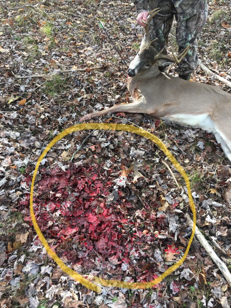 I was getting ready to get down at 9:55am when I saw a couple deer through the woods at about 70-80yds. Sat back down and figured I’d stay a while longer. Few minutes later I heard the heavy thud, thud,thud of a running deer. I turned and saw a doe running over a creek to my left at 20yds. Started to stand to take her and saw good antlers coming behind her. Drew my bow as I was swinging around the split trunk of the tree, gave a loud bleat as he was jumping the creek out of my site due to the tree trunk. He landed in an open spot 20yds away, quartering to looking at me and I hit my mark. It was less than 5 seconds from the time I got a glance of him until the shot. He turned and ran back the way he came, arrow still stuck in his throat. After 30min I got down and went to my truck. An hr later a life long friend of mine showed up with lunch and beers. We went back in and found him 80yds from my stand. Just out of site due to some hemlock trees.