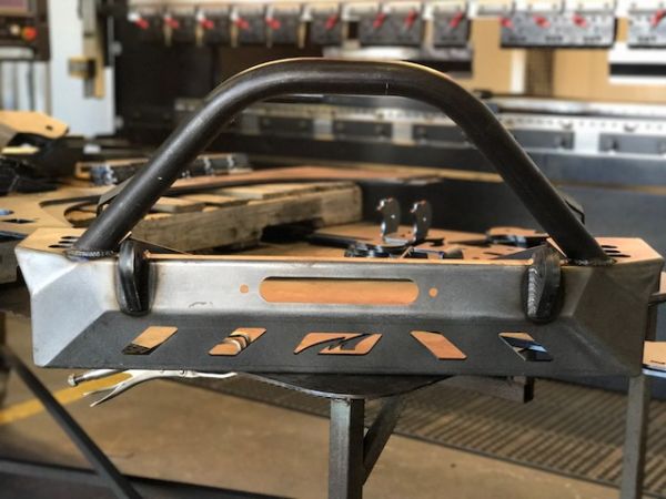 The Motobilt Jeep YJ, TJ, or LJ front bumper with bull bar is the most versatile yet. This bumper like our others is made out of 3/16" thick steel plate that is laser cut and CNC formed in house. The bumper has a modern sleek design that sets it apart from the competitors. The bumper features not only a built in winch mount but also the fairlead mount. The new bumper fits up and over the factory sway bar. So you get the look of a recessed winch but you do not have to modify any of the existing Jeep components. This version has a metal bull bar made out of 1.75" DOM tubing that is welded directly to the bumper and has integrated laser cut support gussets.