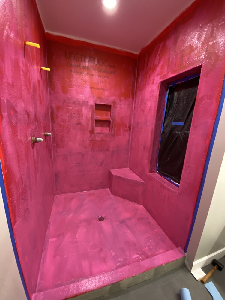 Itās Red Guard waterproofing membrane. You paint it on, then can tile right over it.ok help me out here, whats the pink stuff? Some sort of semi-flexible membrane, or additional waterproofing?