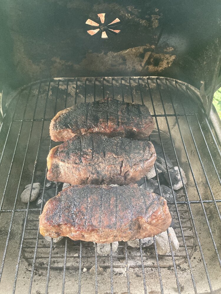 Got dayum what time is dinner!Prime New York, blackened seasoning cooked medium rare over charcoal, Vanilla Porter