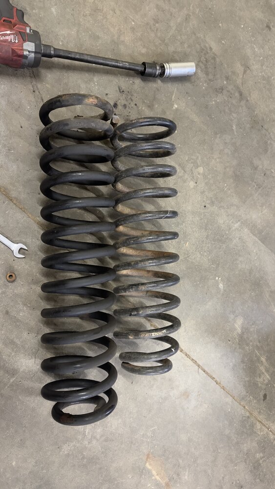 Swapped the front coils for some 2.5” TJ coils that I had laying around and it brought it down about 2” in the rear. Gonna swap in some 2.5” XJ rear leaves leftover from the previous XJ, but still working on getting the bolts to unrust from the shackles. They are moving about a quarter turn, but not out yet. The coils that came out were very tall and stiff, so hopefully the new ones ride better.