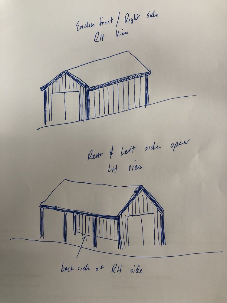 Im open to suggestions as I don’t want to create any issues. The main goal is to keep the sun off the front and right side on a gravel floor and not have it blow over. A wall on the rear gable is an option as well, but I’d like the left hand side to remain open. Maybe I’m over thinking it, opinions?