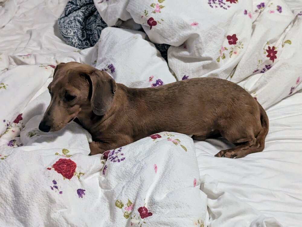 I freaking hate that thing. It has cost us a ton of money, it has wrecked our basement carpet, chewed through cords, chewed any thing in front of its stupid face that it runs into. It’s cute but won’t let you touch it. I would give it a pass if it snuggled with anyone. But it doesn’t.