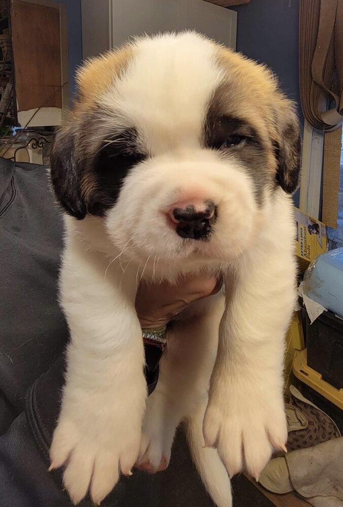 One of the St Bernard breeders I was in contact with messaged me 5 days ago, to let me know they just had a litter of pups to a smooth coat female. Pending health analyses, the purple collar is mine. She’s 7 days old today.