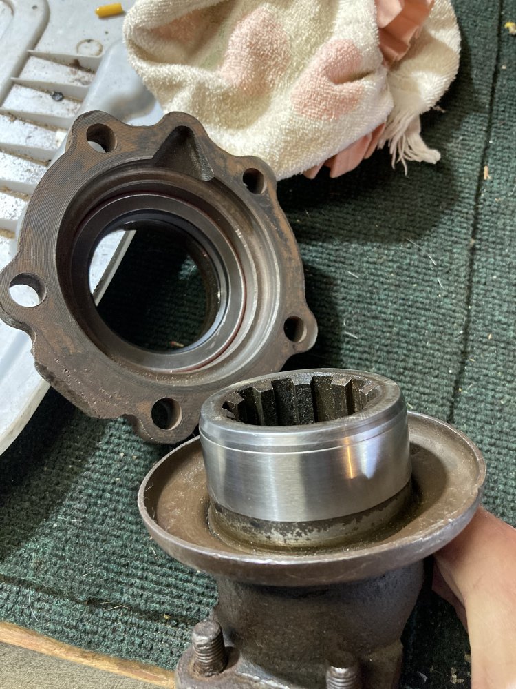 Got the readi sleeve installed on the yoke and a new pinion seal. Had a heck of a time getting the cotterpin that locks the pinion nut out of the hole. Probably spent over an hour between drilling, punching, oiling, cussing. Got the nut on and back to its location from 1960 something. Can anyone give me the center to center bolt hole measurement for the pinion cartridge on a 14 bolt? I’m curious if the Barnes pinion guard will work with my