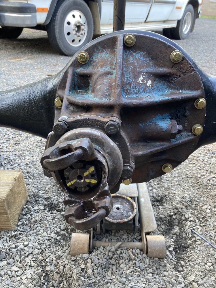Got the readi sleeve installed on the yoke and a new pinion seal. Had a heck of a time getting the cotterpin that locks the pinion nut out of the hole. Probably spent over an hour between drilling, punching, oiling, cussing. Got the nut on and back to its location from 1960 something. Can anyone give me the center to center bolt hole measurement for the pinion cartridge on a 14 bolt? I’m curious if the Barnes pinion guard will work with myView attachment 342589View attachment 342590