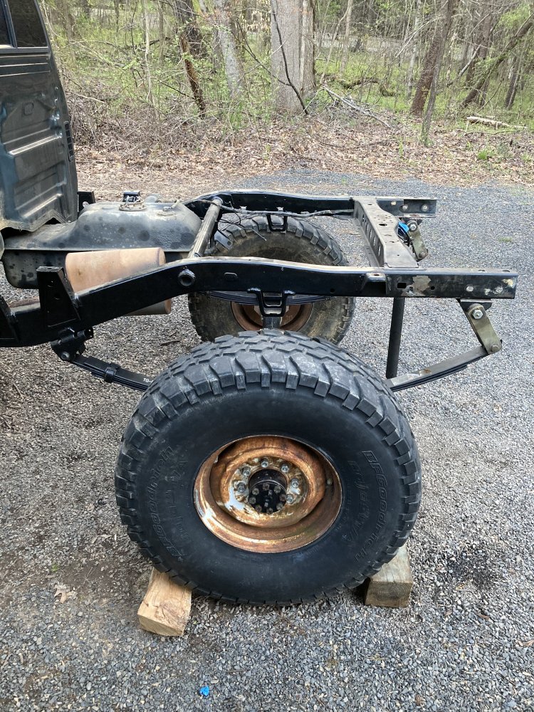 Pulled the radiator to access the back side of the front spring hanger. Was really hoping to get it welded in tomorrow but doesn’t look like weather is going to cooperate. I’m considering moving rear axle forward to center it in the wheel well vs hacking the back of the wheel well off to fit the stretched wheel base. I’d like some input. @cgm147 been looking for your old black trucks build thread.