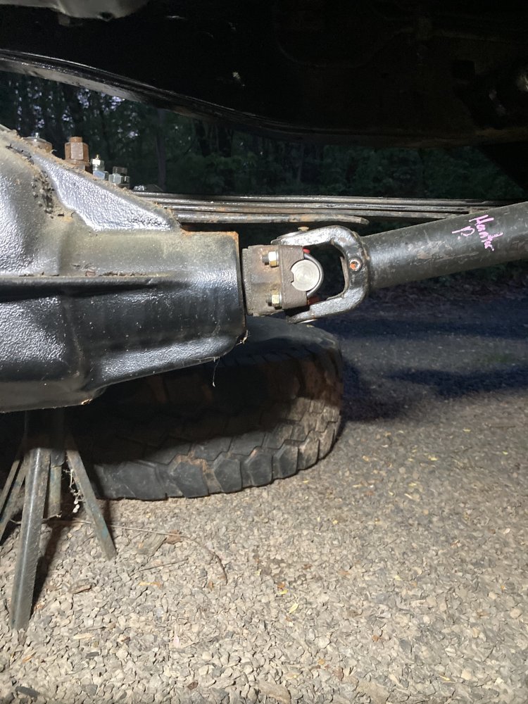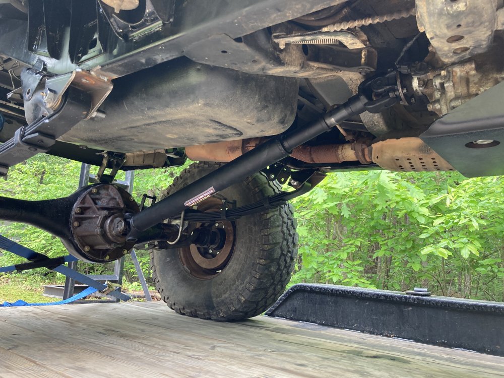got the pinion angle set and rear spring perches welded on yesterday. Hated to do it in my unlevel gravel driveway, but it needed to get done. Couldn’t afford to have Oliver’s do my rear shaft, so I cut the slip section out and sent it to Taylor driveline in Monroe.