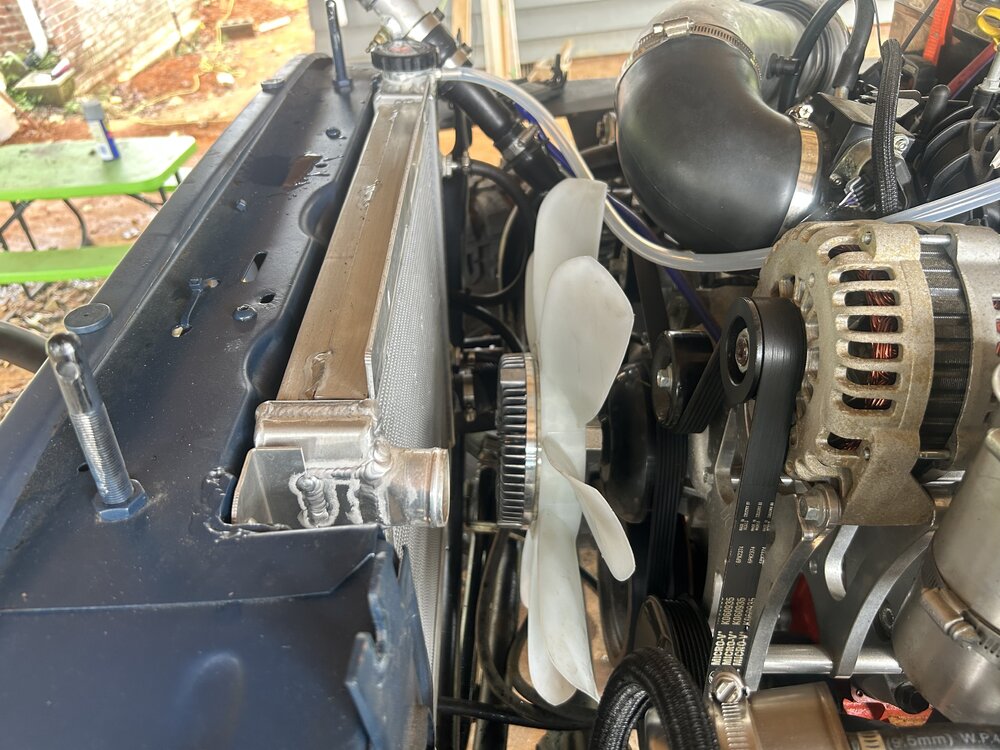 So I’m going mechanical fan. Also, hated the look of a grill bar, and wanted to section the grill for more access. Also wanted to remove the fenders as they limited travel. I’m going to move the grill hoop behind the radiator, make rad mounts on the grill hoop that make the rad parallel to the fan for shrouding, section the grill, and use some Chris Durham fender deletes, then notch the hood where I get tire rub at full stuff. Might get a Durham hood in the future.